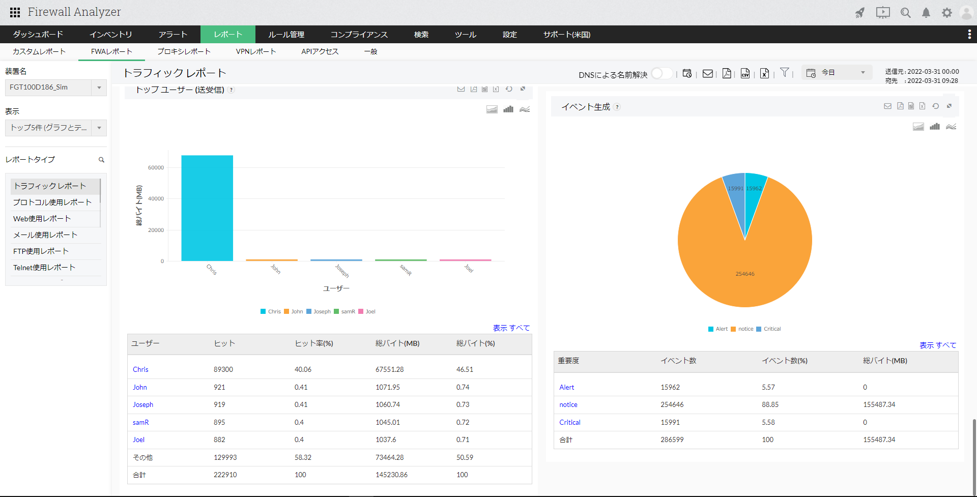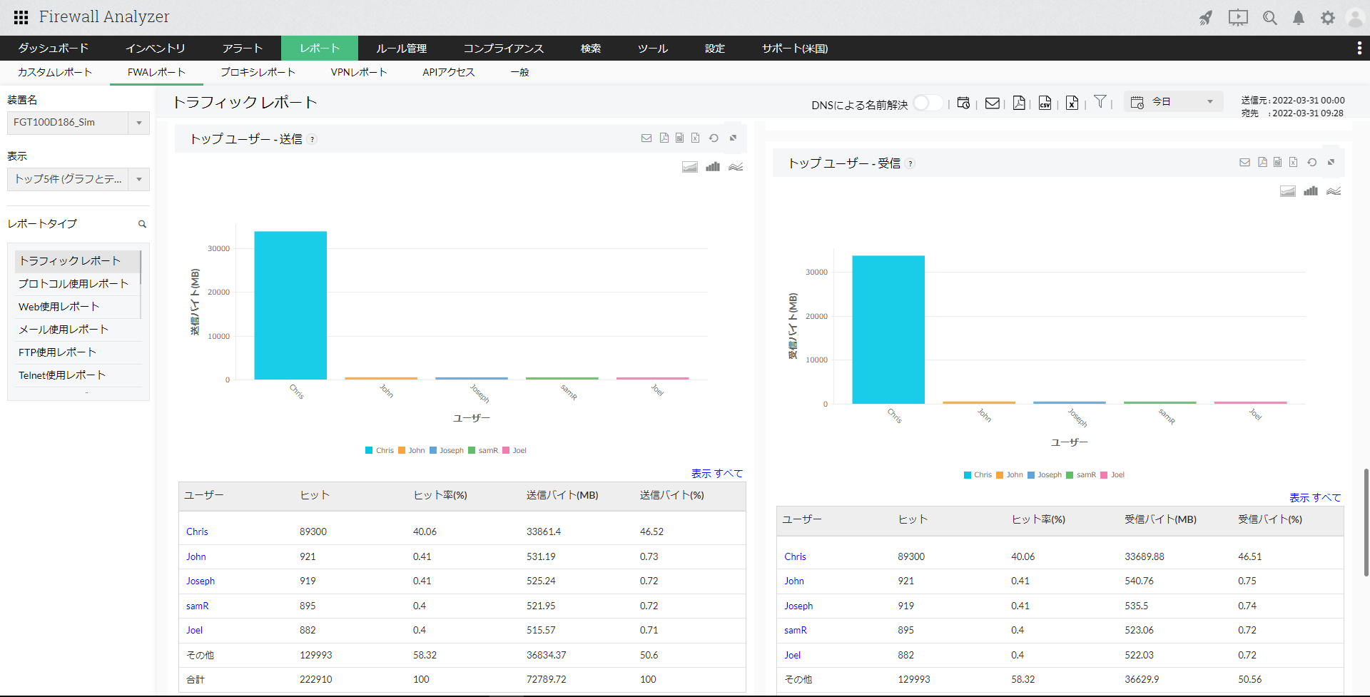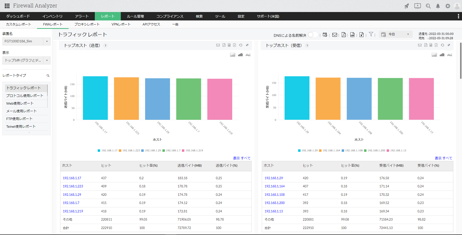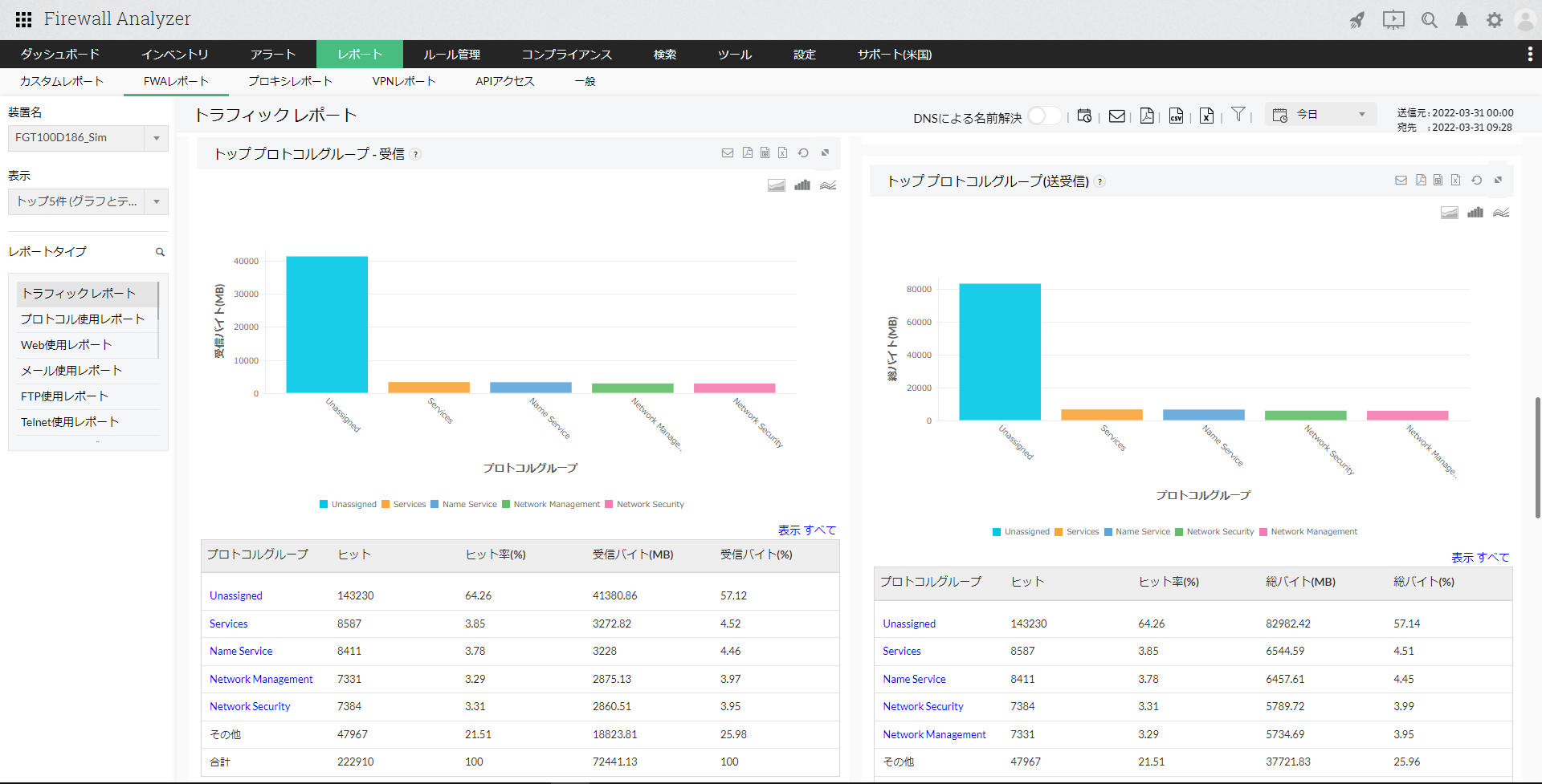 トラフィックレポートは、ファイアウォールを通過(permit/accept)した送受信トラフィック量に基づいた帯域使用率を表示します。