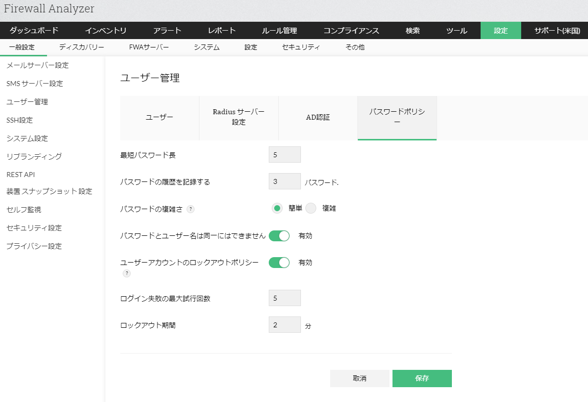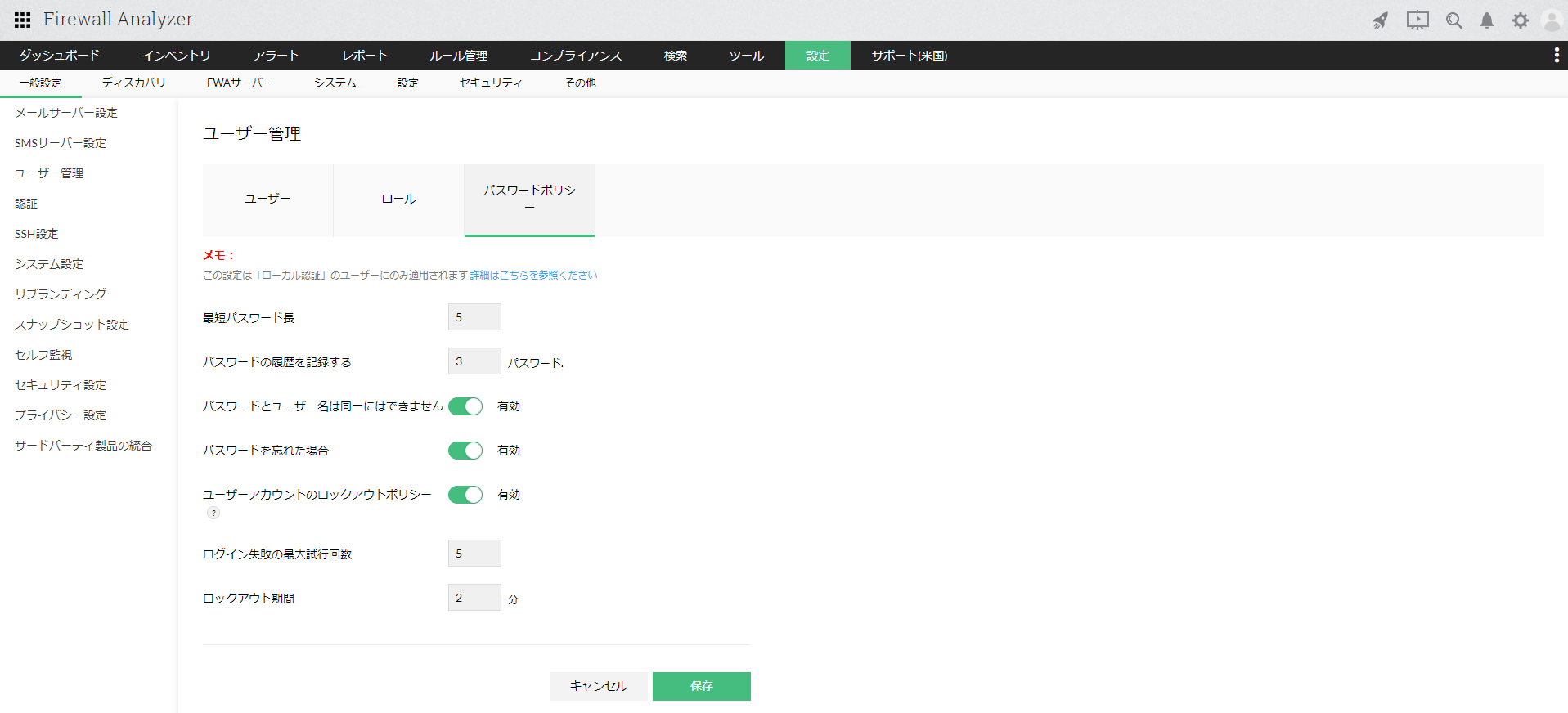 この設定では、Firewall Analyzerのユーザーアカウント作成時のパスワード長やログイン時の試行回数など、ログインパスワードに関するポリシーを設定します。