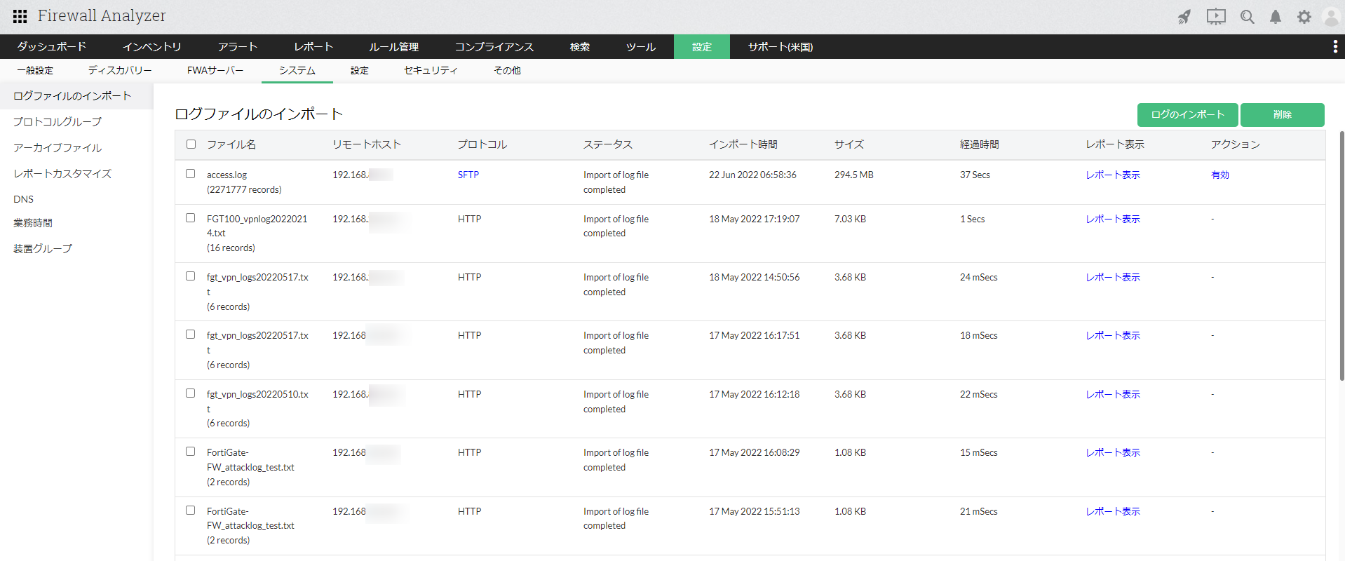 - 本機能を使用してインポートしたログデータを削除する機能は実装されていません。