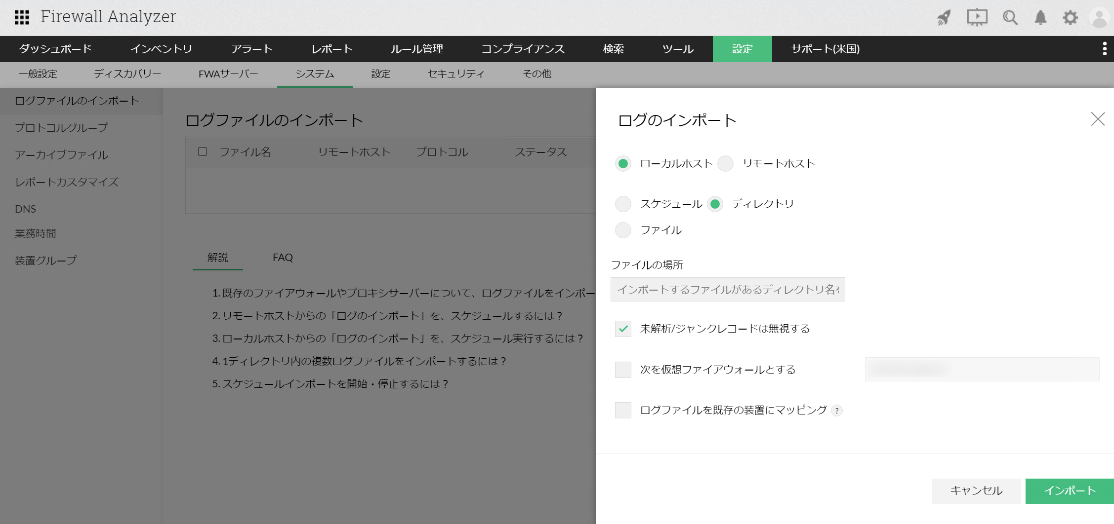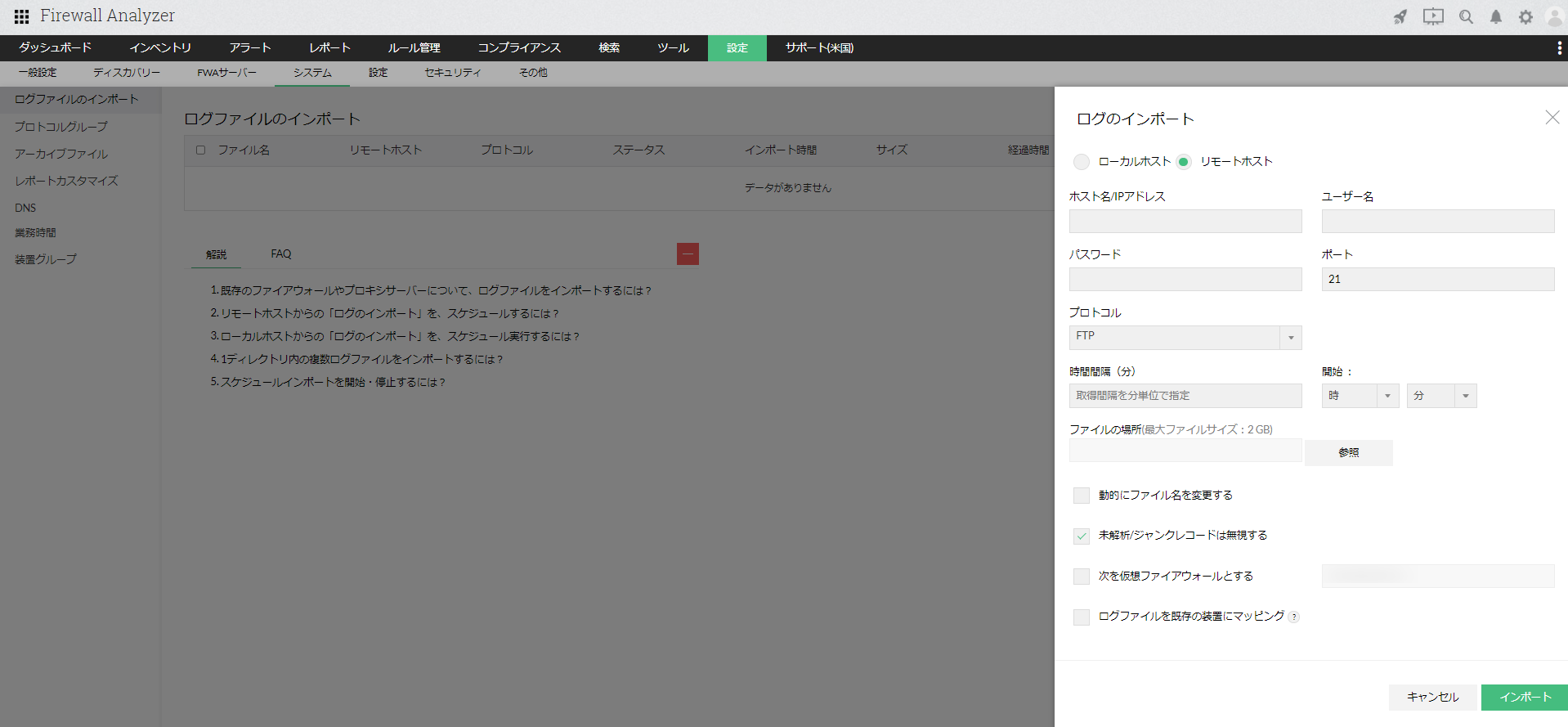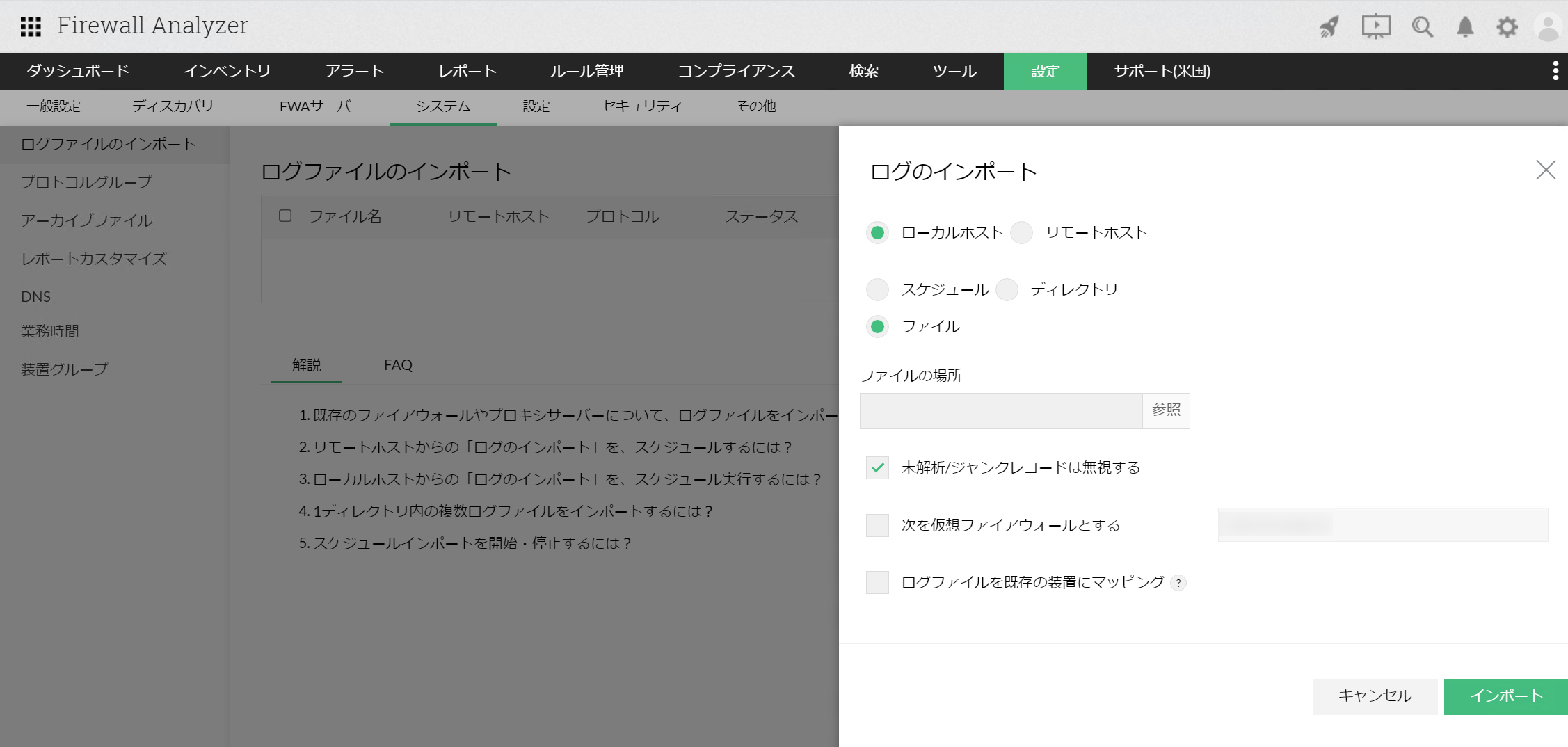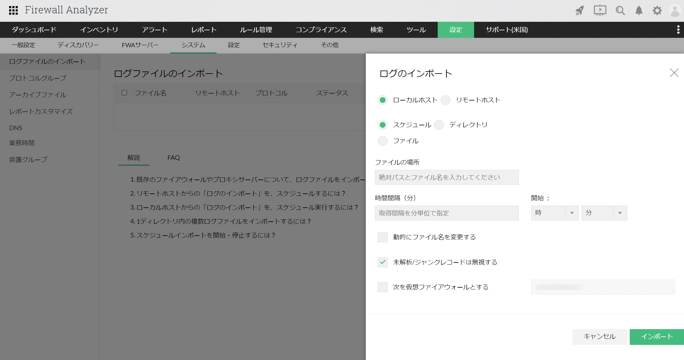 Firewall Analyzerに接続している端末上(インストールサーバー含む)にログファイルが存在する場合、「ローカルホスト」を選択してインポートを実施します。
