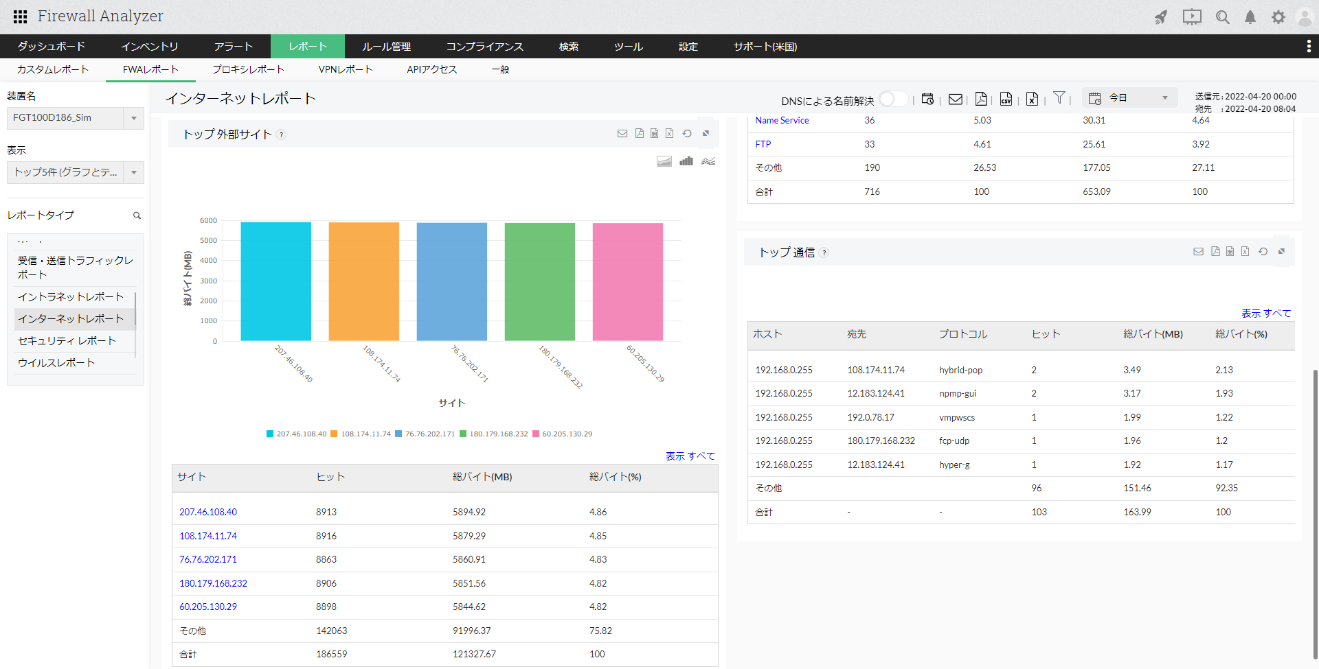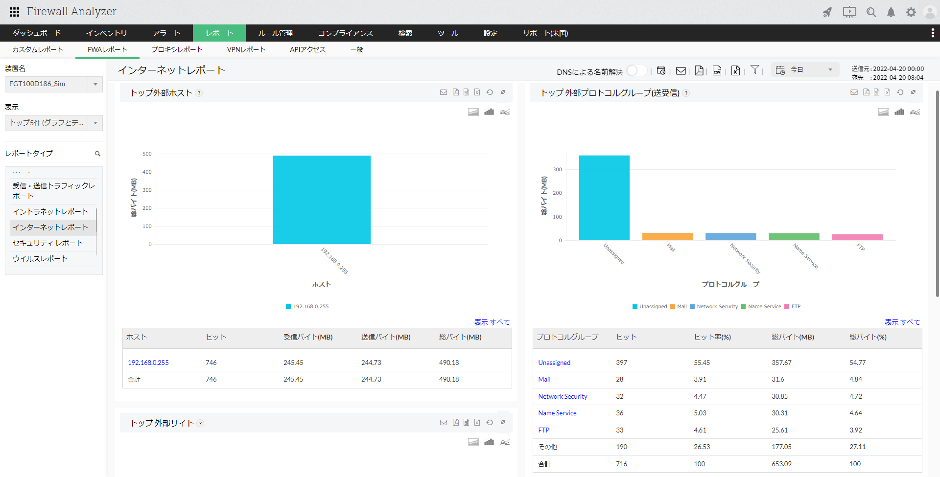 インターネットレポートは、外部ホスト(LAN外部のホスト)からファイアウォールを介して発生したトラフィックに関する情報を表示します。