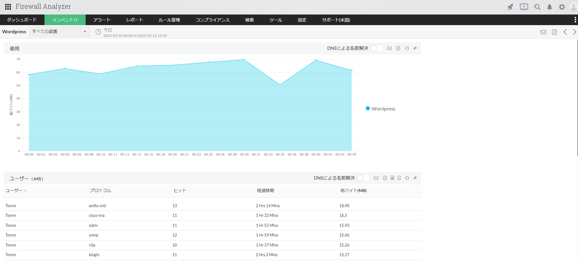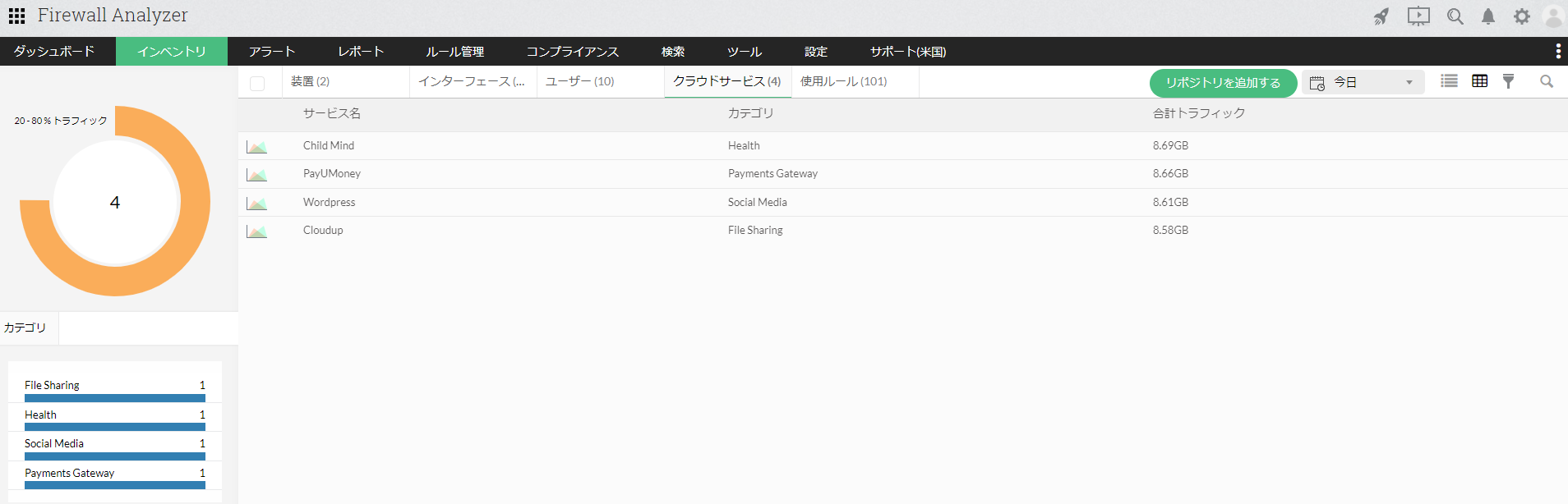 [クラウドサービス]画面では、Firewall Analyzerに追加された装置を介して通信が発生しているクラウドサービスが一覧で表示されます。