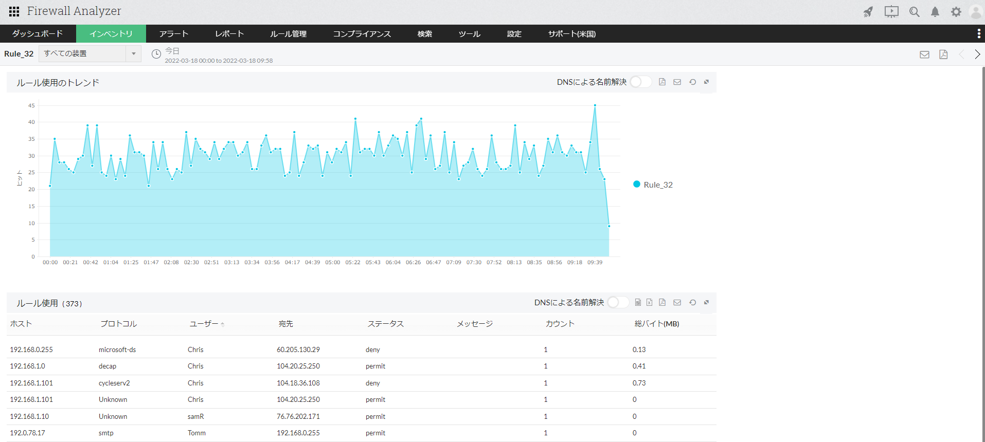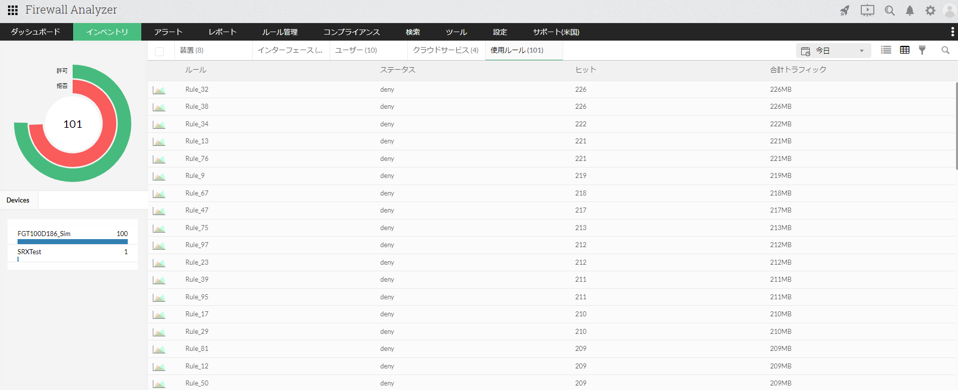 [使用ルール]画面では、Firewall Analyzerに追加された装置のうち、対象装置でトリガーとして使用されたルール情報(ルール番号、ヒット数、トラフィック数)を一覧で表示します。