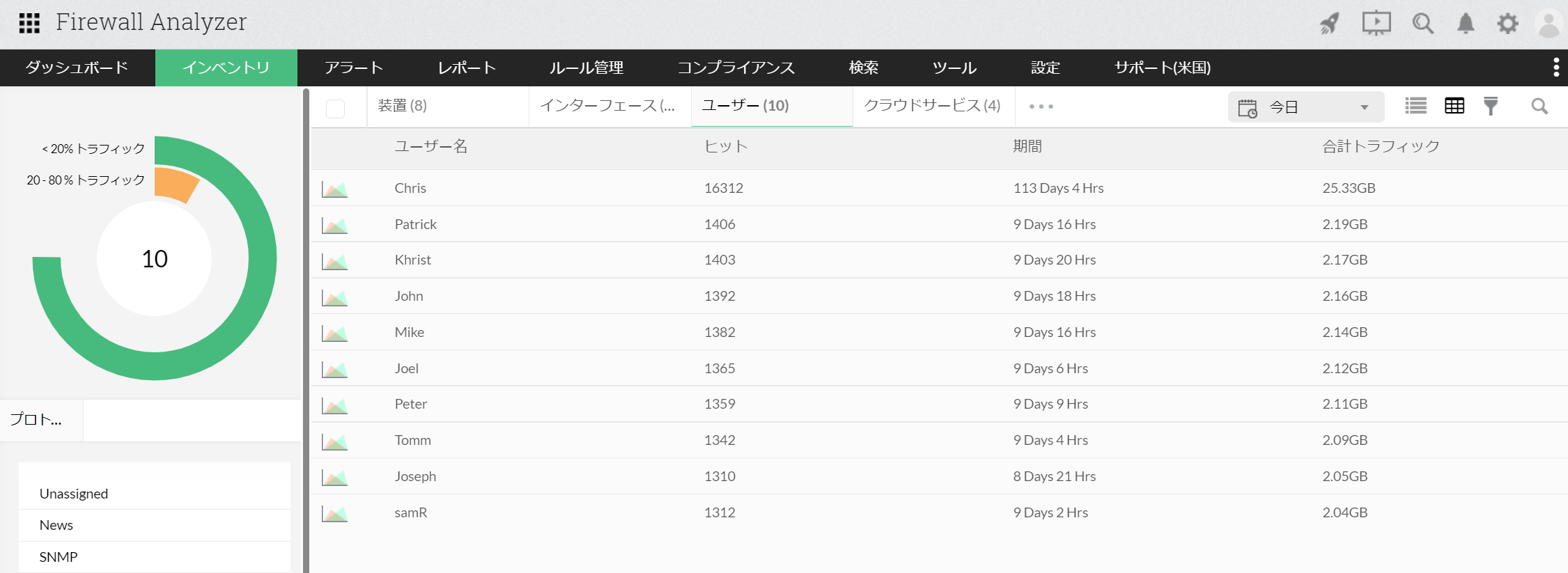 [ユーザー]画面では、Firewall Analyzerに追加された装置を通じて発生した通信のうち、ユーザーに焦点をあて情報を一覧で表示します。