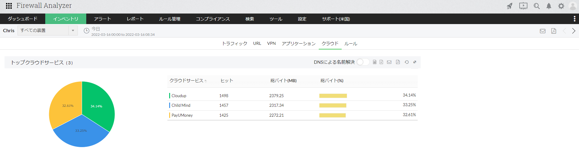対象ユーザーが使用したクラウドサービス情報(クラウドサービス名、ヒット数、バイト数)を一覧で表示します。