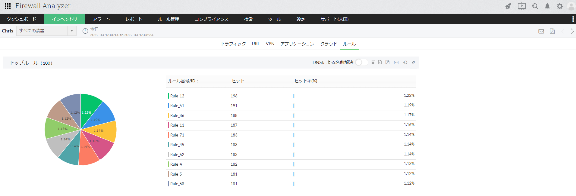 対象ユーザーの通信に該当するルール情報(ルール番号/ID、ヒット数)を一覧で表示します。