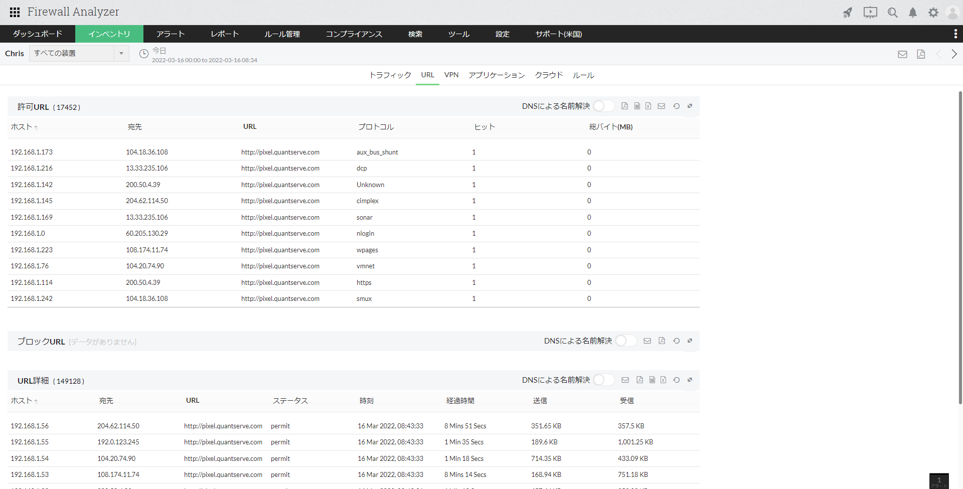 許可、拒否されたURL情報、およびその通信内容を一覧で表示します。
