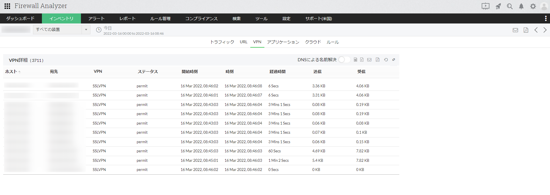 該当ユーザーが行ったVPN通信のホスト、宛先、VPNタイプ、開始/終了時刻を一覧で表示します。