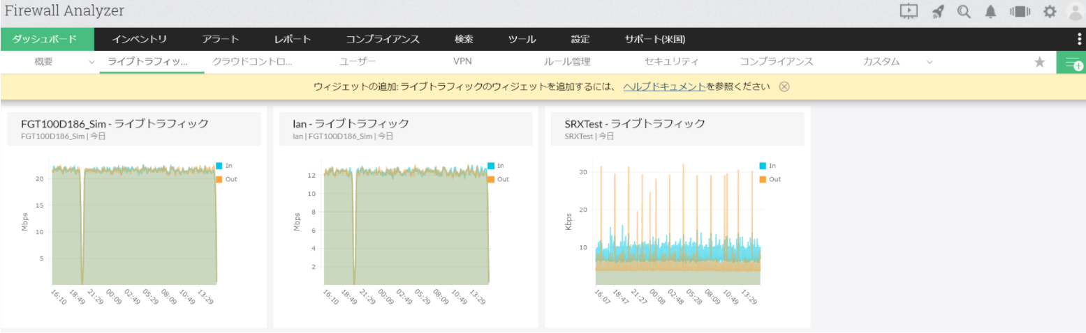 ライブトラフィックでは、装置ごと、インターフェースごとのライブデータを各ウィジェットに分けて表示することができます。