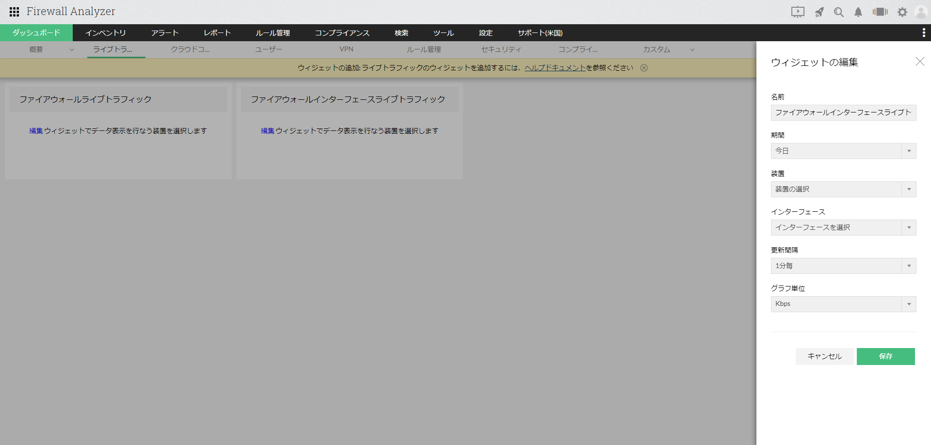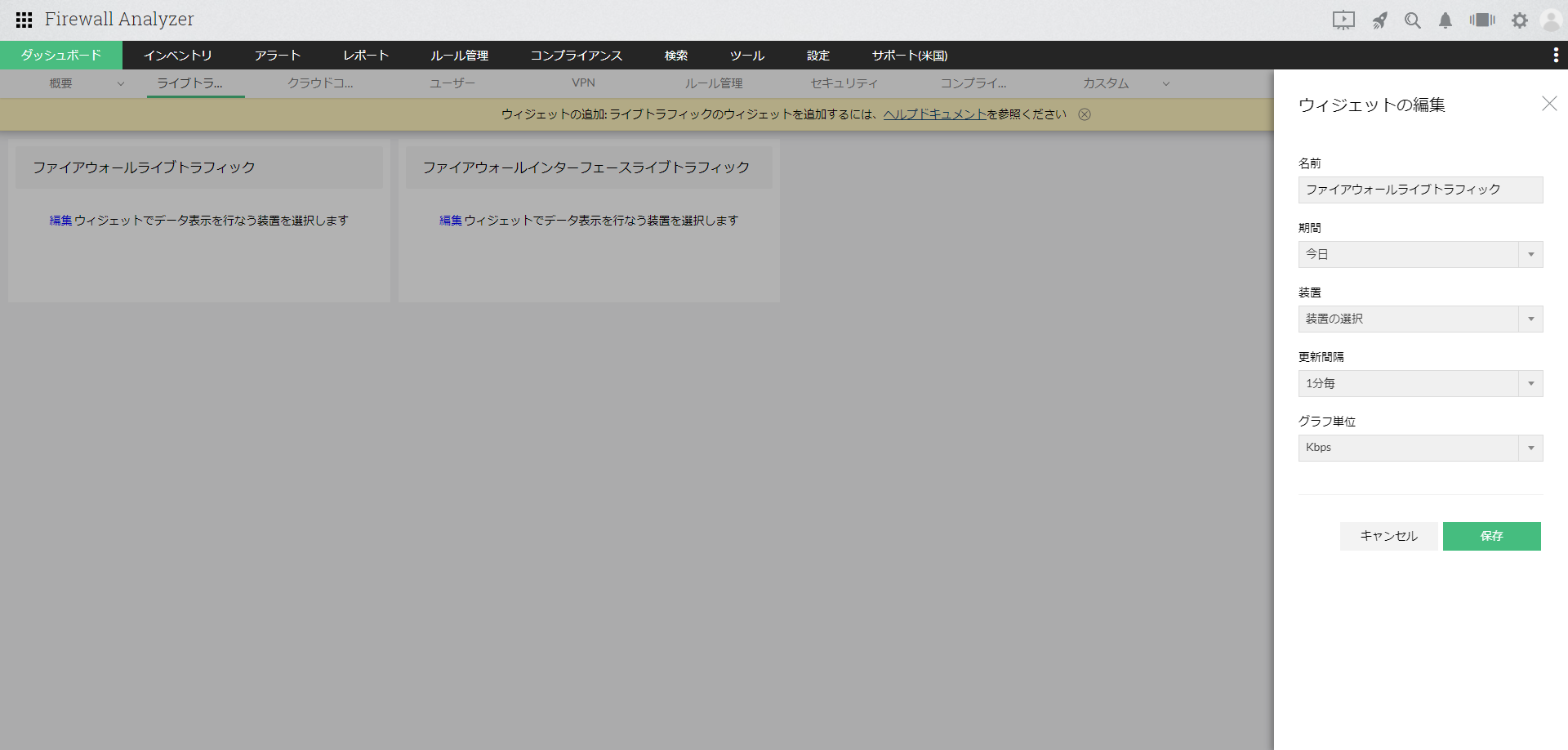 [ファイアウォールライブトラフィック]ウィジェットを追加後、編集アイコンより、データを表示する対象装置の情報を選択します。