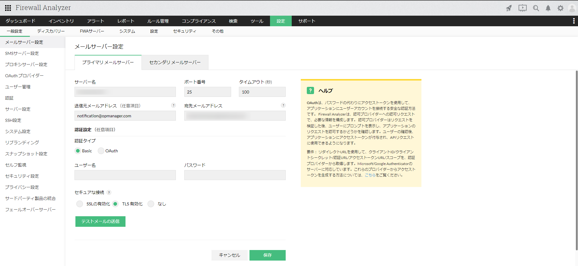 メールアラート通知や カスタムレポート(スケジュールレポート)を受信するために、Firewall Analyzer上でメールサーバーを設定する必要があります。