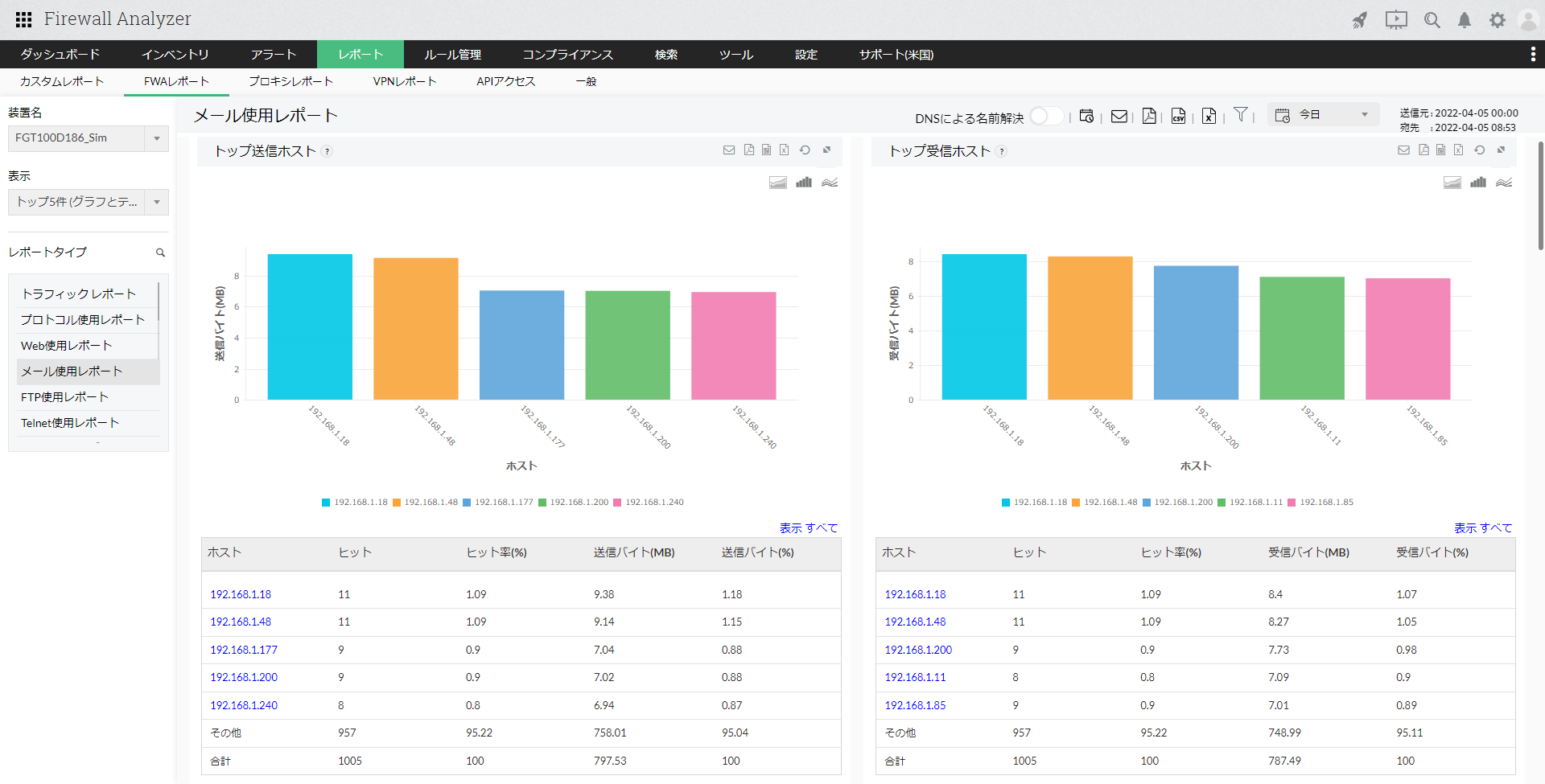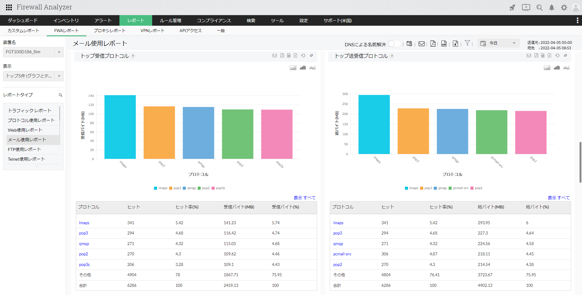 メール使用レポートは、ファイアウォールを通過(permit/accept)したメールプロトコルグループに基づいた帯域使用率を表示します。