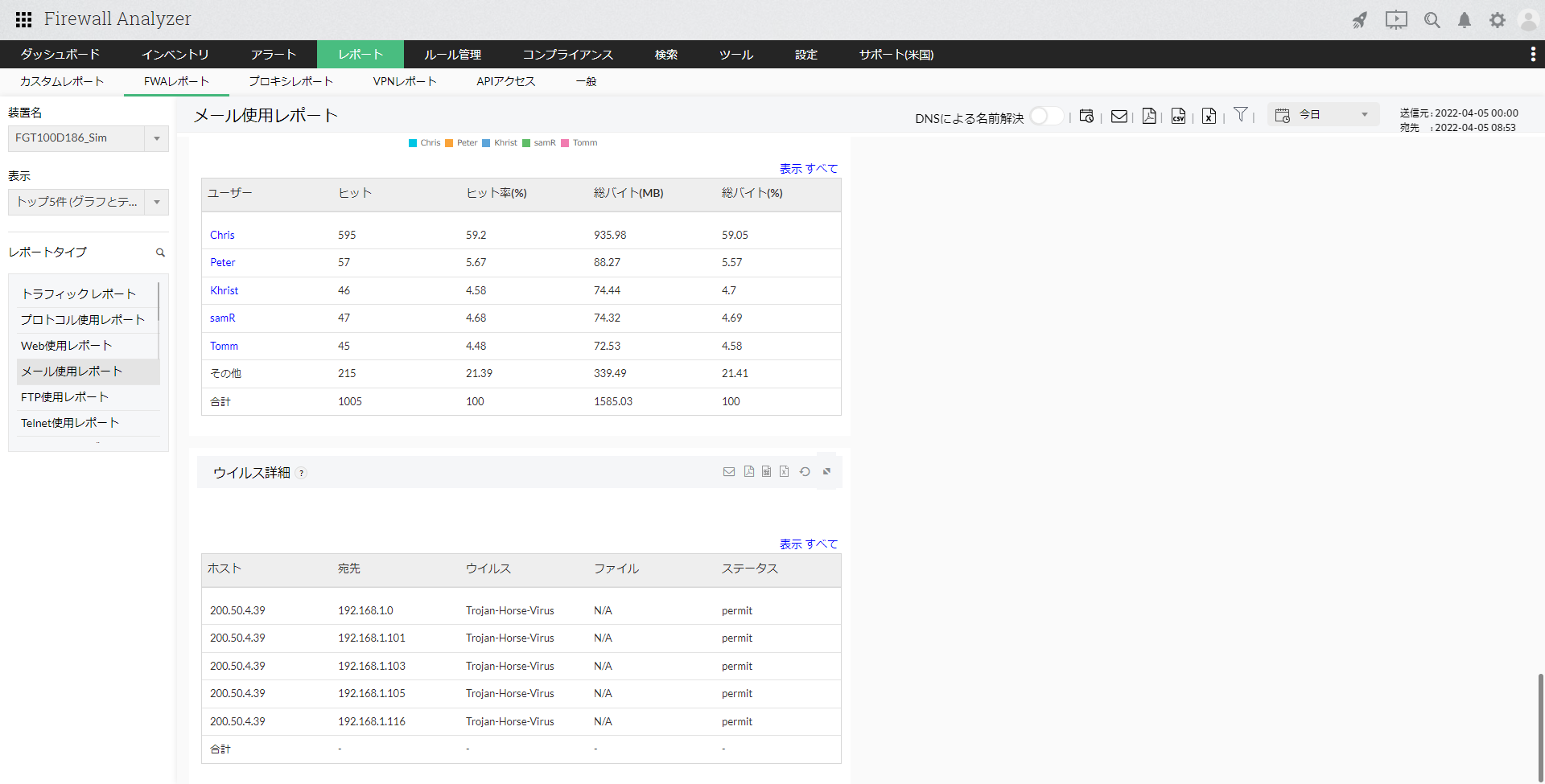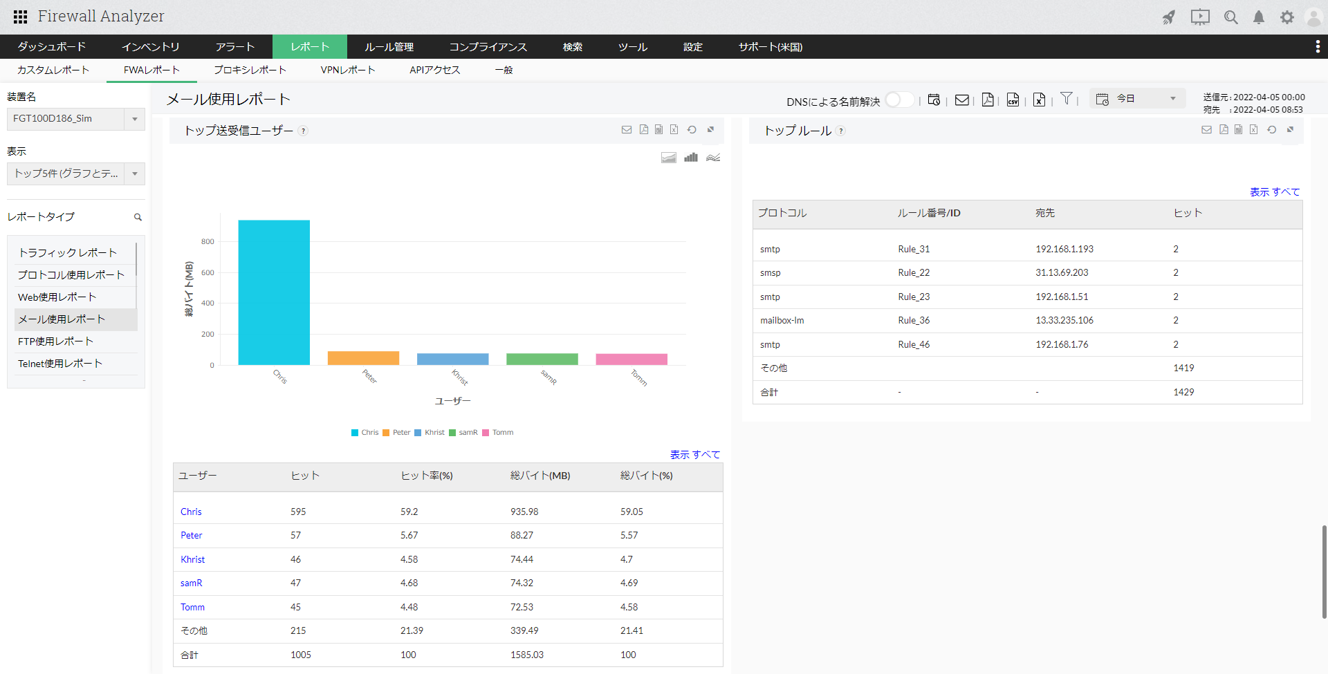 | トッププロトコル | ユーザーが使用している上位のメールプロトコルを表示します。ヒット数、送信/受信/合計バイト(MB)が一覧で表示されます。 |