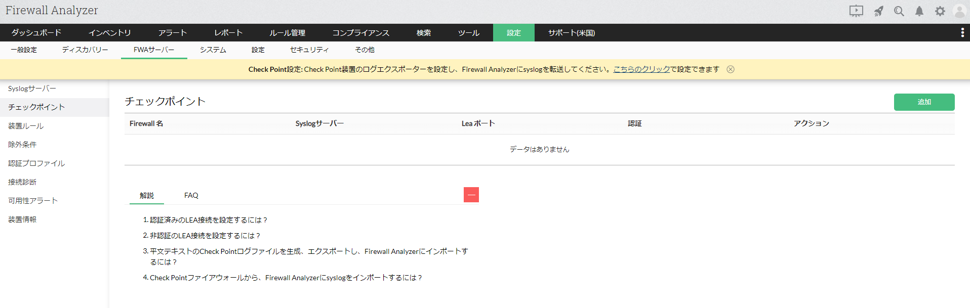 - [設定]→[FWAサーバー]→[Check Point]画面右上の[追加]をクリック