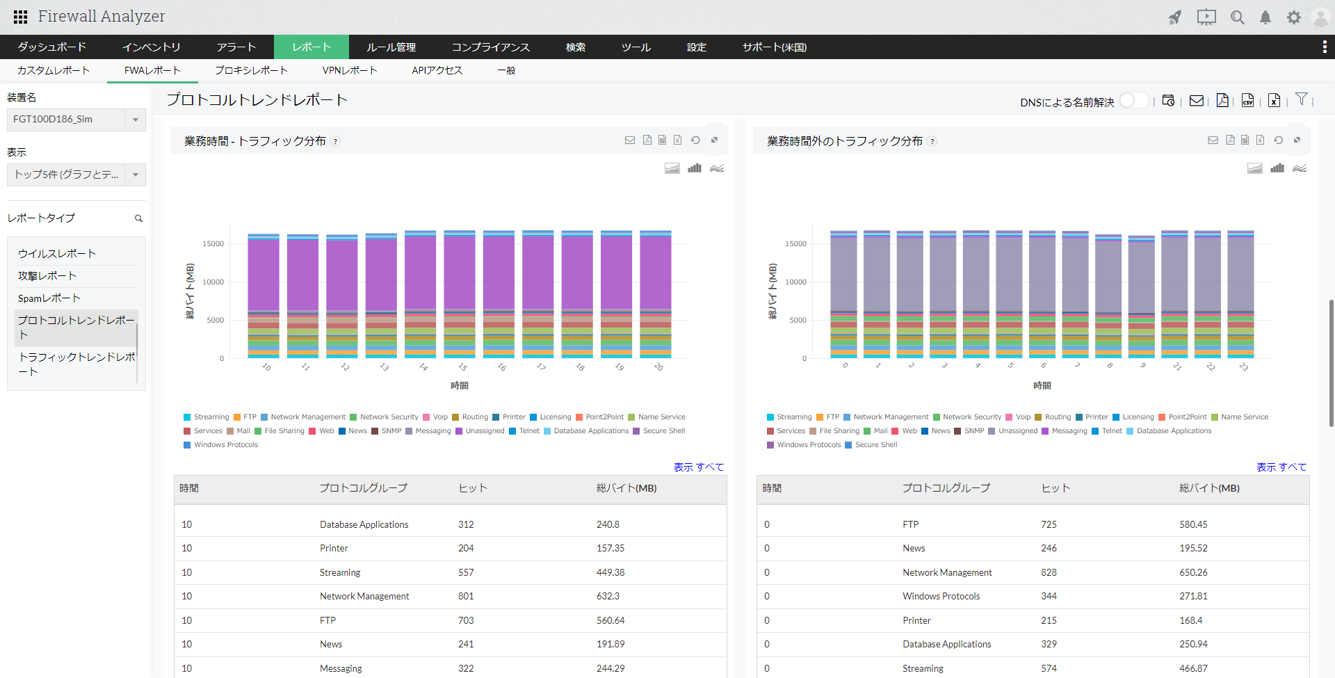プロトコルトレンドレポートは、各種プロトコルグループ(Web、FTP、Telnet、メール)で発生したトラフィックのトレンド情報を表示します。