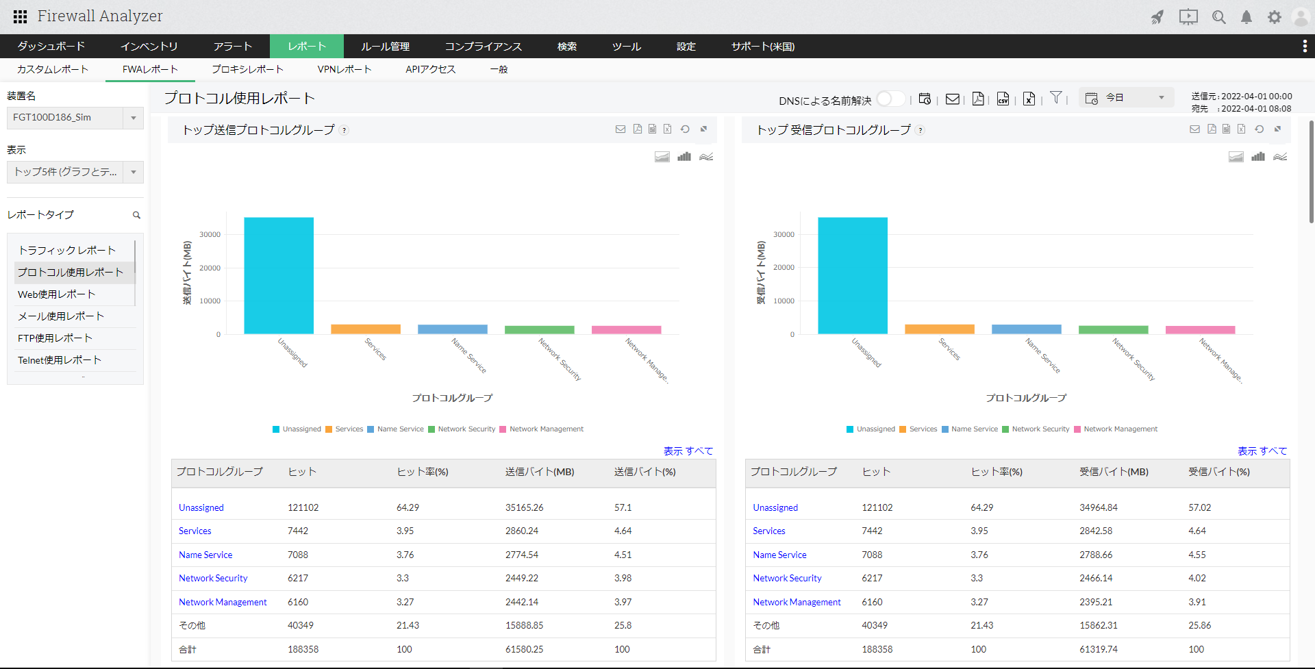 プロトコル使用レポートは、ファイアウォールを通過(permit/accept)してトラフィックを生成しているプロトコルグループに焦点をあて、その帯域使用率を表示します。