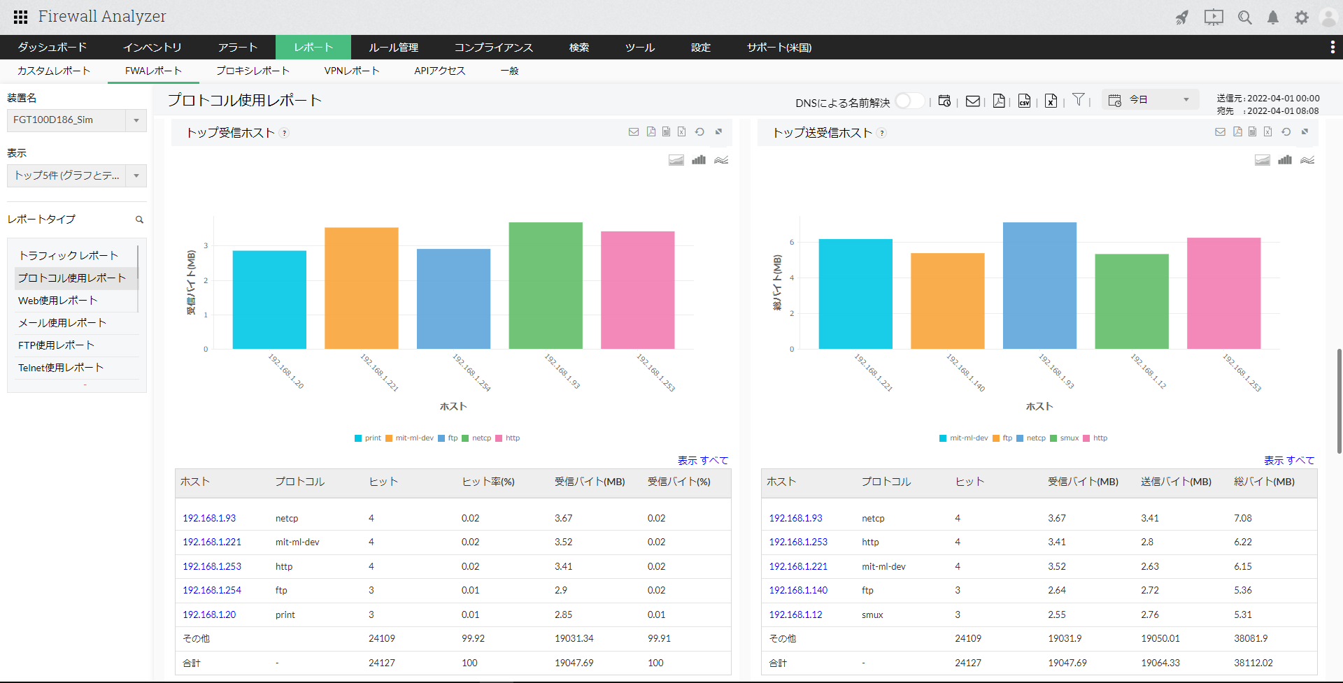 [トップ送受信ホスト]では、上位のホストに対して、プロトコル、ヒット数、受信バイト(MB)、送信バイト(MB)、総バイト(MB)の情報を表示します。