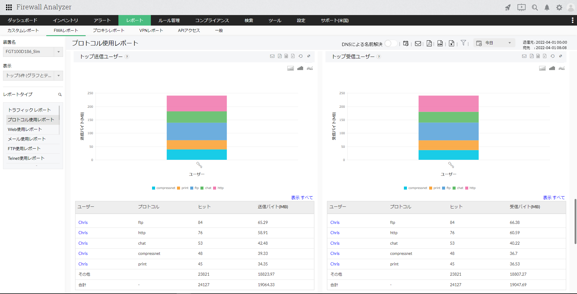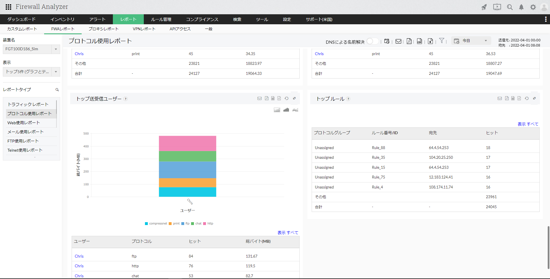 [トップ送受信ユーザー]では、上位のユーザーに対して、プロトコル、ヒット数、総バイト(MB)の情報を表示します。
