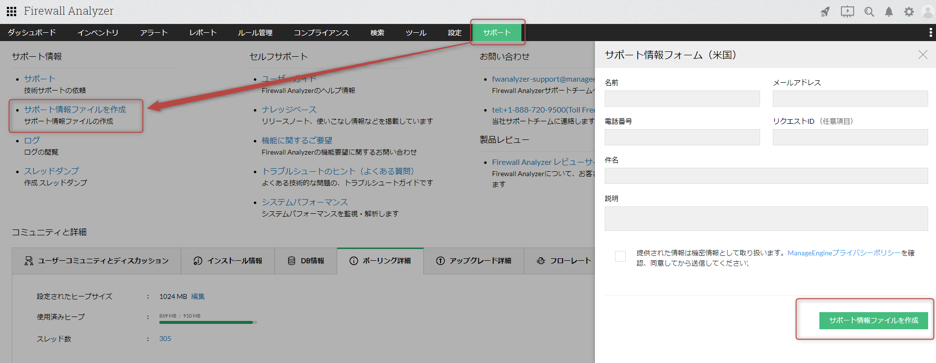 - [サポート情報フォーム(米国)]画面で、[サポート情報ファイルを作成]をクリック