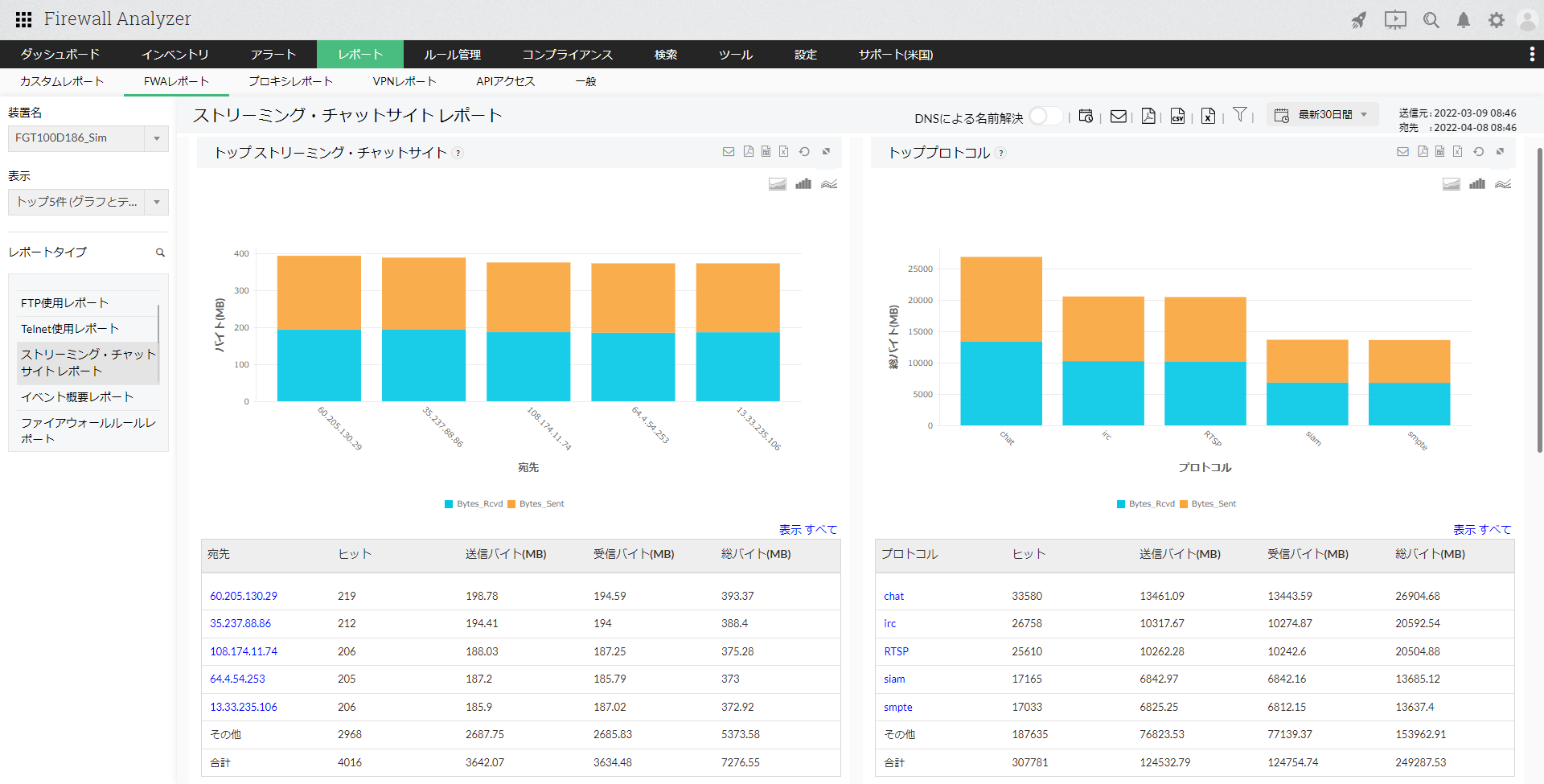チャットストリーミング・サイトレポートは、ユーザーがファイアウォールを介して通信したストリーミングサイトやチャットサイトに関する帯域使用率を表示します。