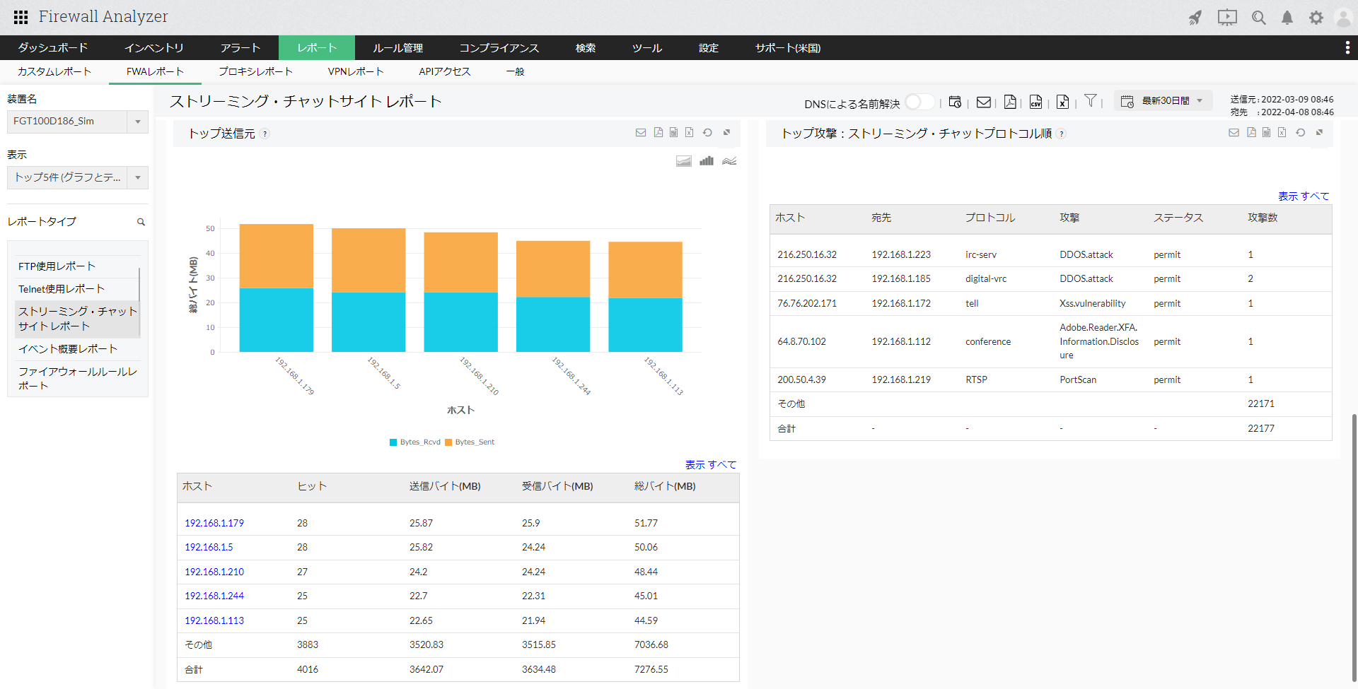 ストリーミングサイト、チャットサイトにアクセスした上位のホスト情報(ホスト、ヒット数、送信バイト、受信バイト、総バイト)を表示します。 - トップ攻撃ストリーミング・チャットプロトコル順: