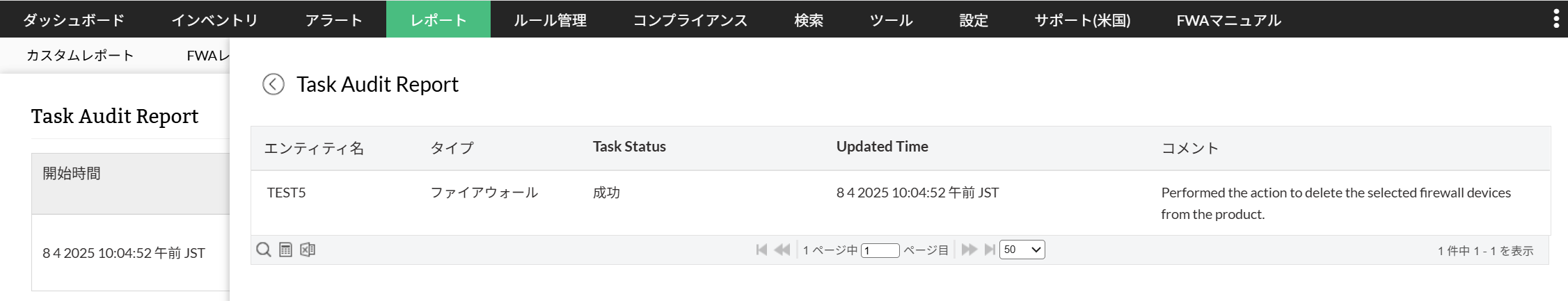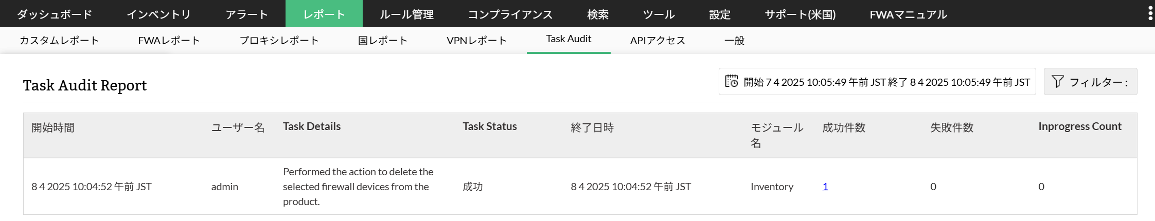 タスク監査レポートで、システム内で発生した操作をタスクレベルで表示します。このレポートは装置やエンティティで実行されたタスクの状態を監視し分析します。