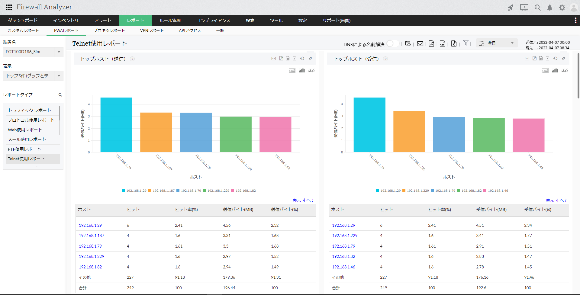 | トップ通信 | Telnetプロトコルを使用している上位の通信を表示します。ホスト、宛先、プロトコル、ヒット数、送信/受信/合計バイト(MB)、送信/受信/合計バイト(%)が一覧で表示されます。 |