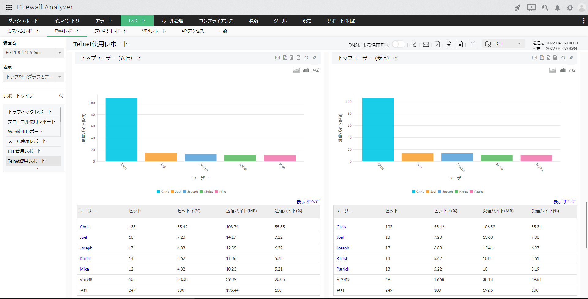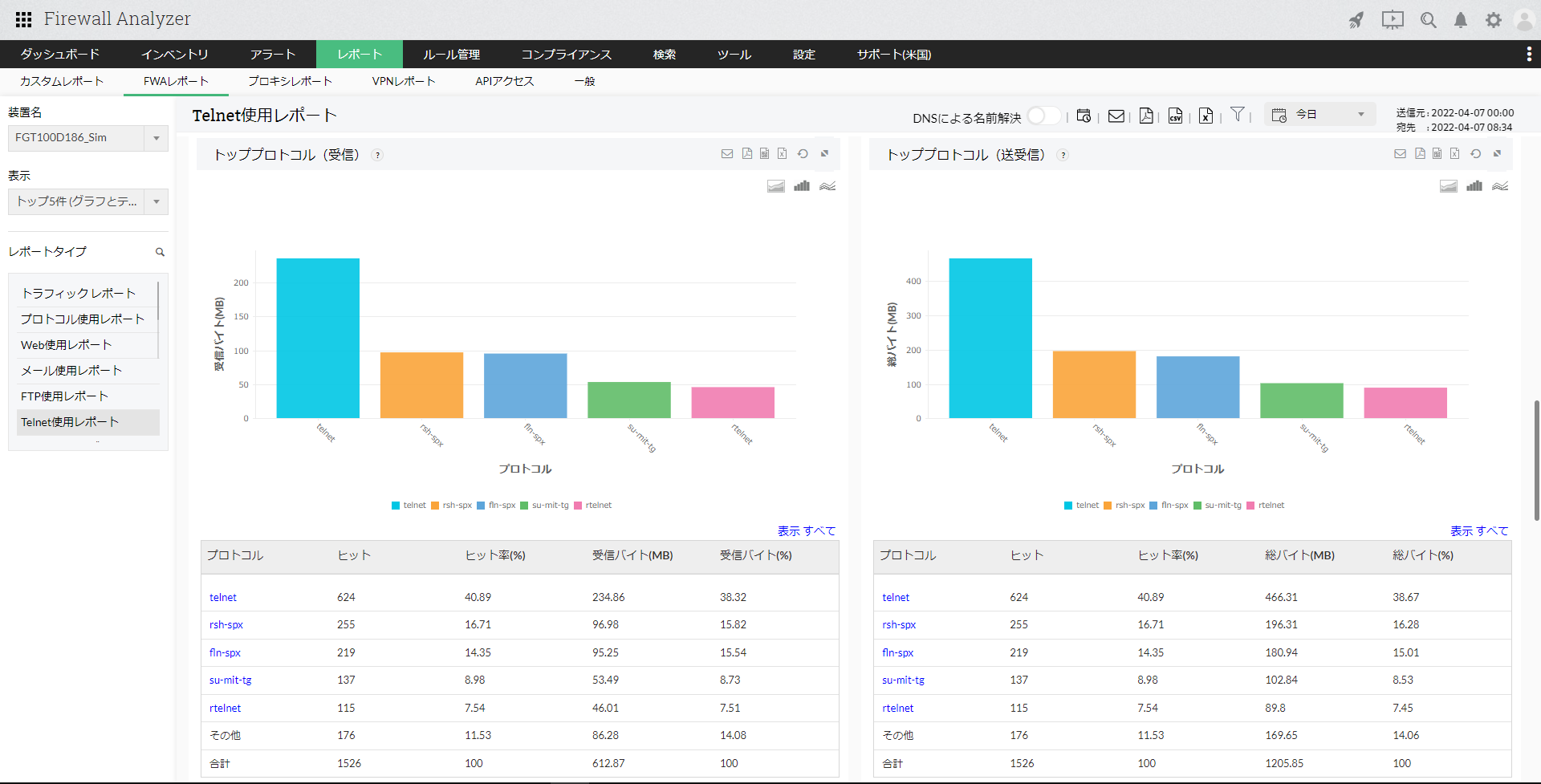 | トッププロトコル | ユーザーが使用している上位のTelnetプロトコルを表示します。ヒット数、送信/受信/合計バイト(MB)が一覧で表示されます。 |