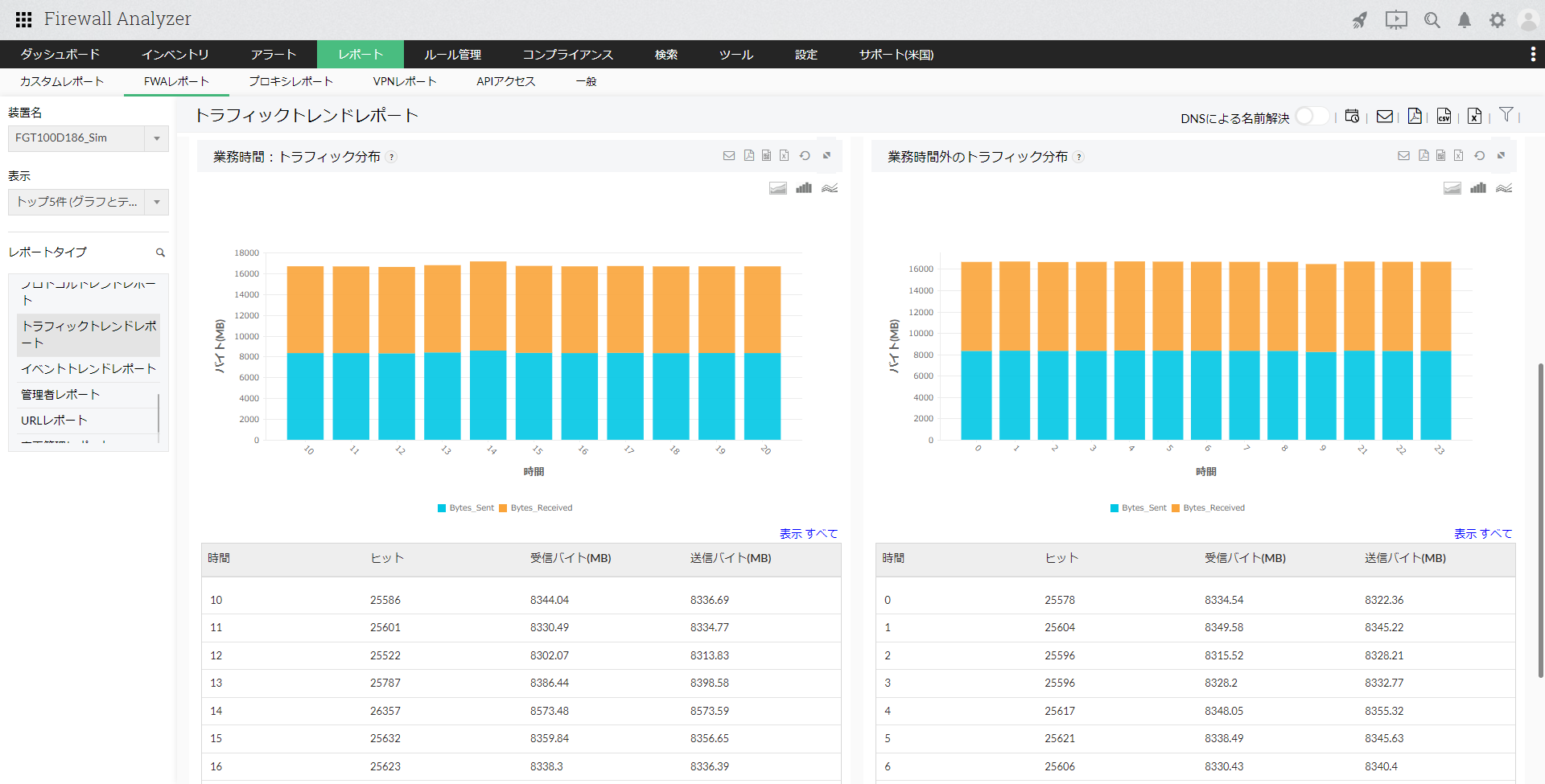 一覧には、時間、ヒット数、受信バイト、送信バイトが表示されます。 - 業務時間外のトラフィック分布: