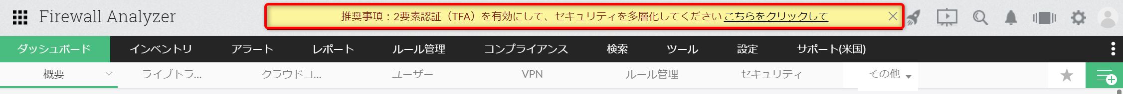 挙動については、こちらのページをご参照ください。 - 2要素認証を有効化すると、Firewall Analyzerで作成されているその他のユーザーアカウントにも設定が有効化されます。