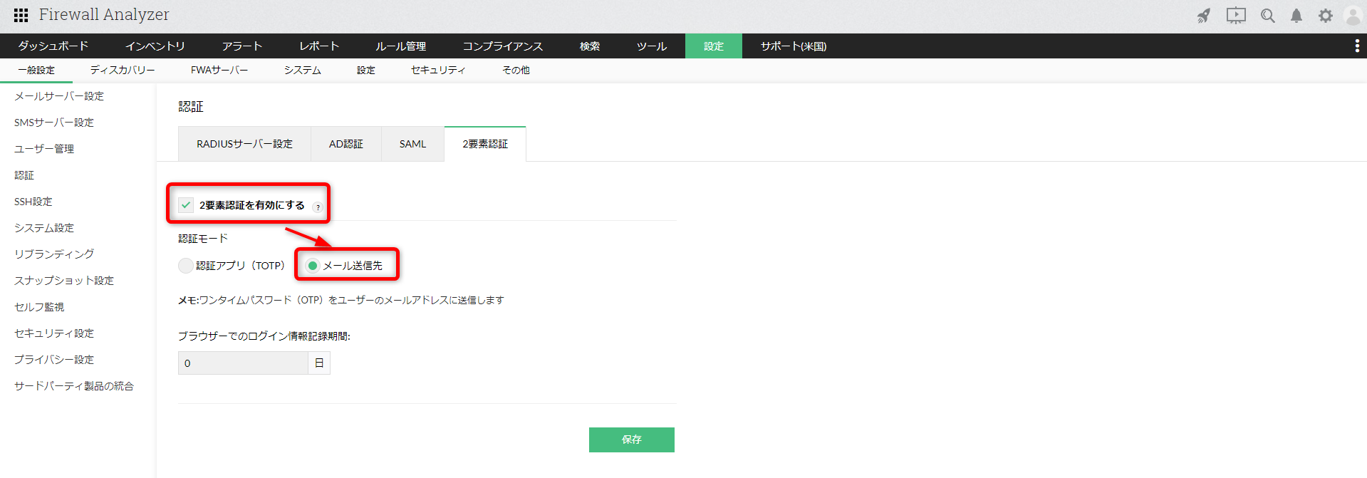 [ブラウザーでのログイン情報記録期間]は、2要素認証によるログインが成功後の認証保持日数を設定します。