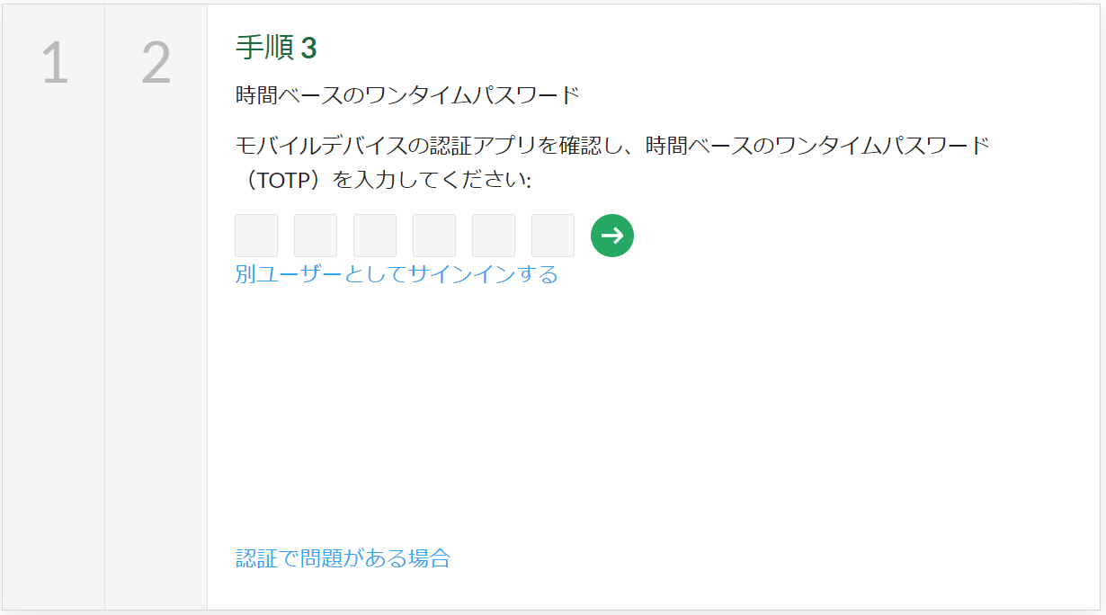 その後手順3の画面で、モバイル端末に表示されたワンタイムパスワードを入力しログインします。