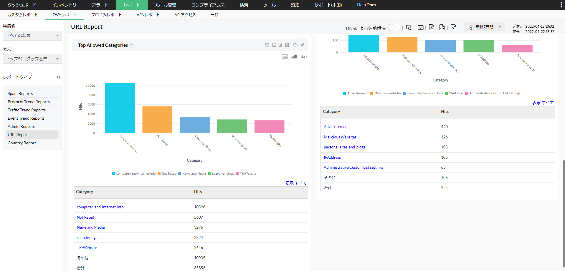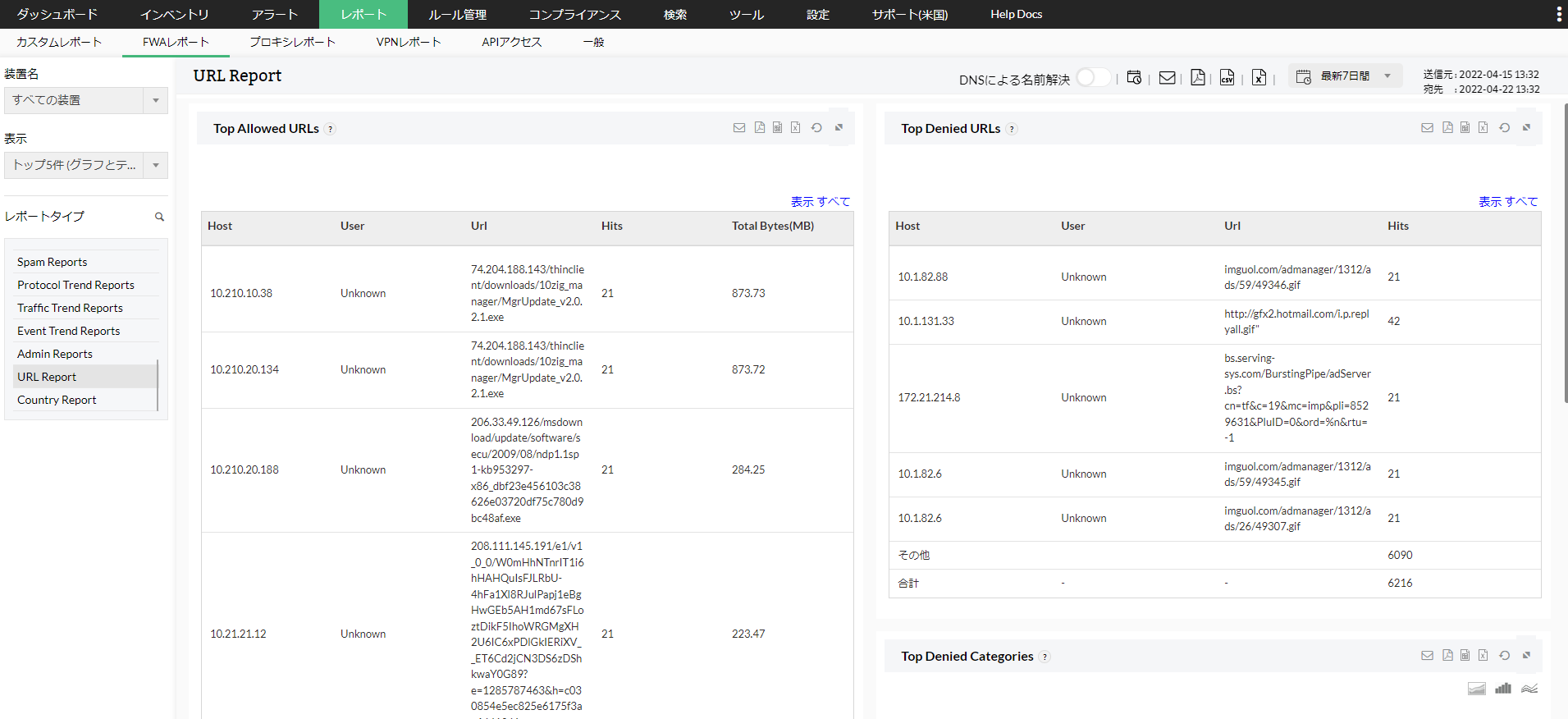 URLレポートは、ファイアウォールのログから取得したURLならびにカテゴリ情報を表示します。