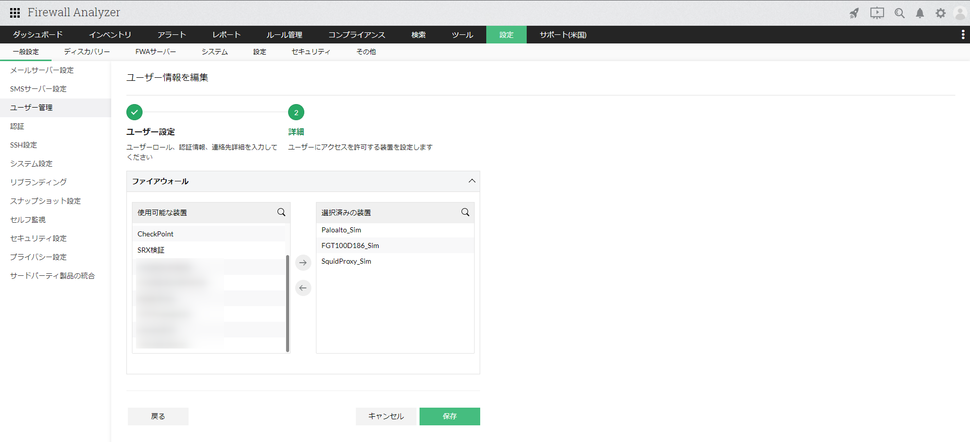 | 装置の編集、削除 | すべてのファイアウォールを対象に可能 | 割り当てられた装置のみ可能 ※削除不可 |