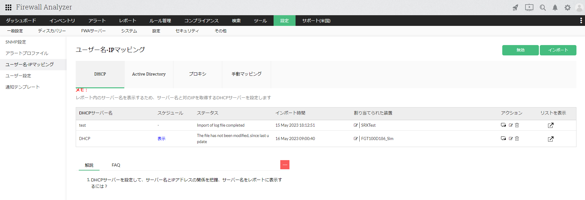 | ステータス | DHCPサーバーログのインポート状況を表示します。 |