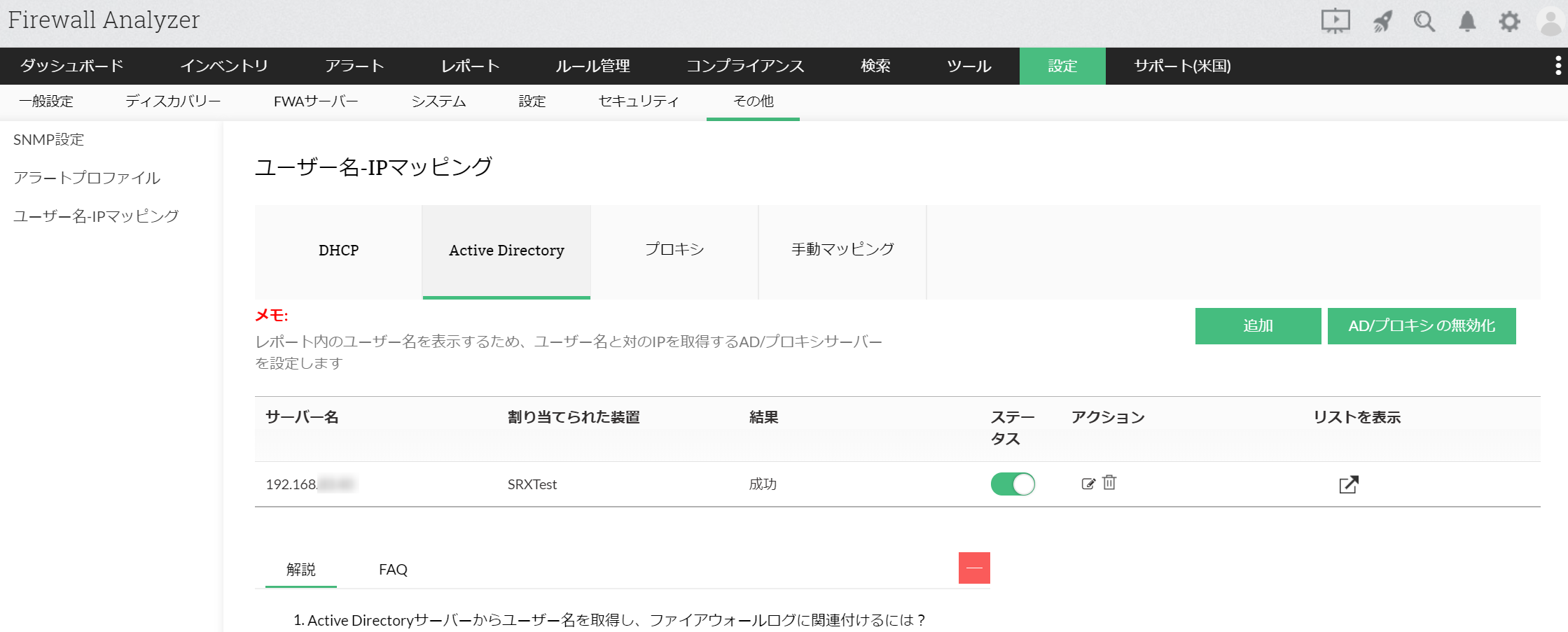 ユーザー名とIPアドレスとのマッピングは、AD(Active Directory)連携やプロキシサーバーのログ情報を使用し、