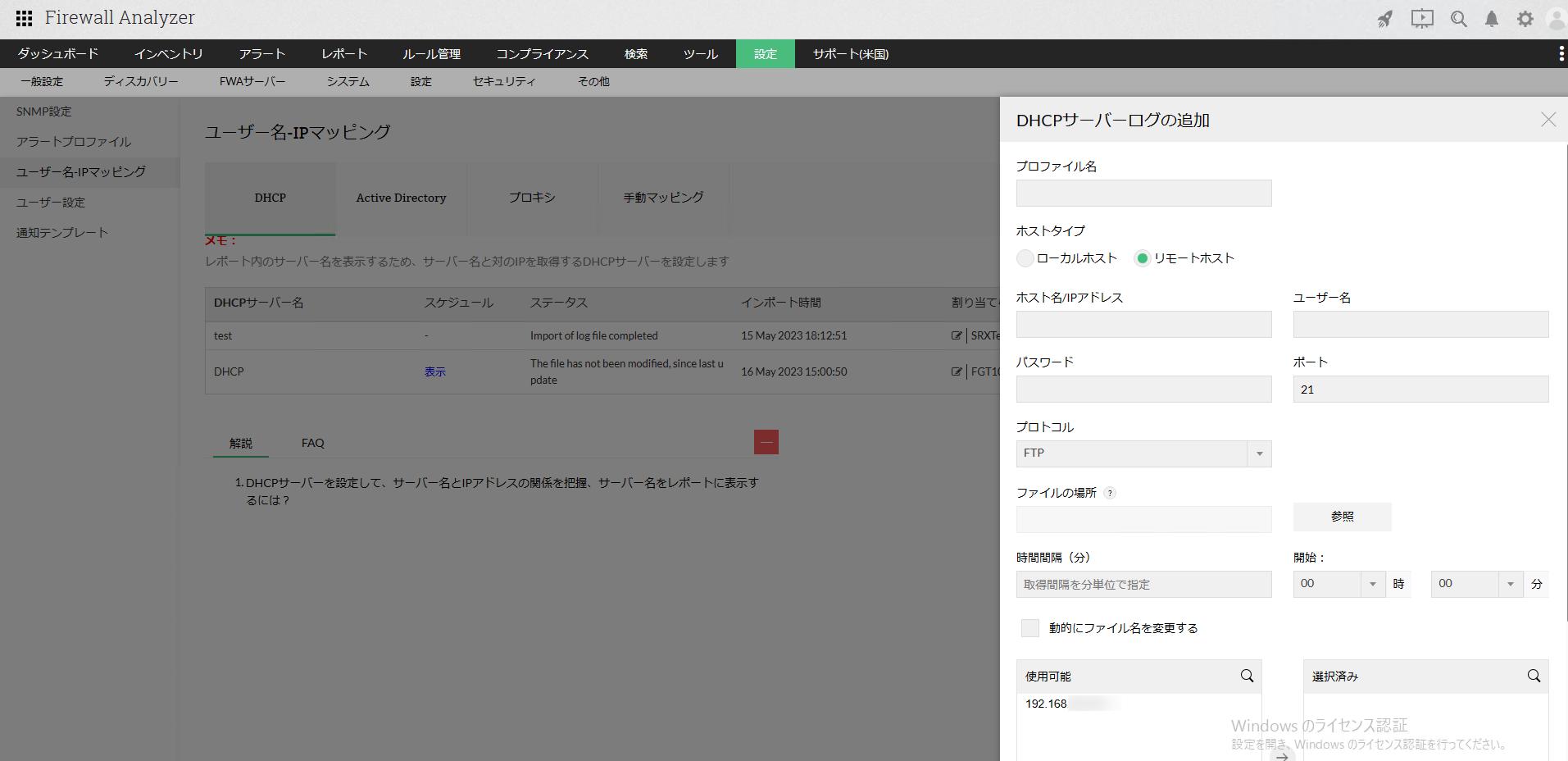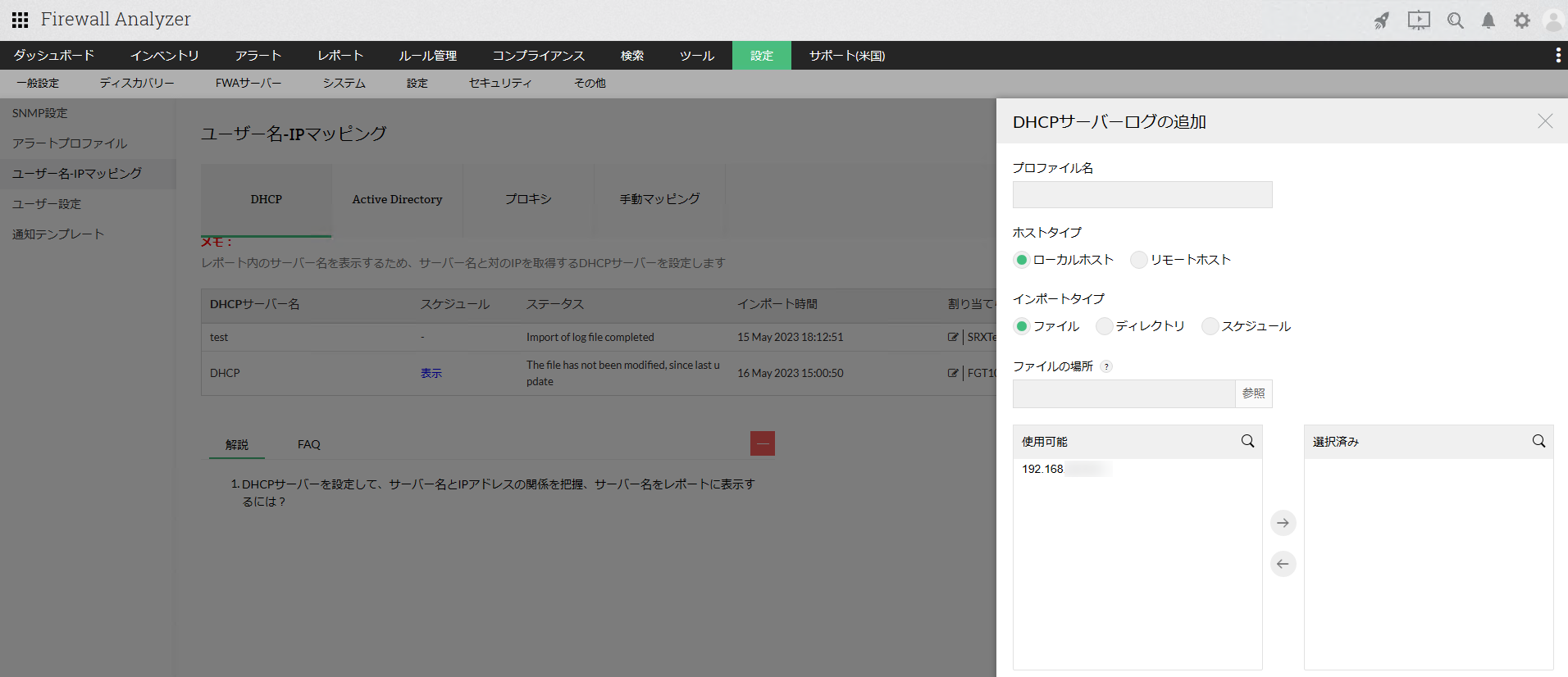 ローカルサーバー上のDHCPサーバーログをインポートします。- ローカルサーバーからFirewall Analyzerにアクセスした場合