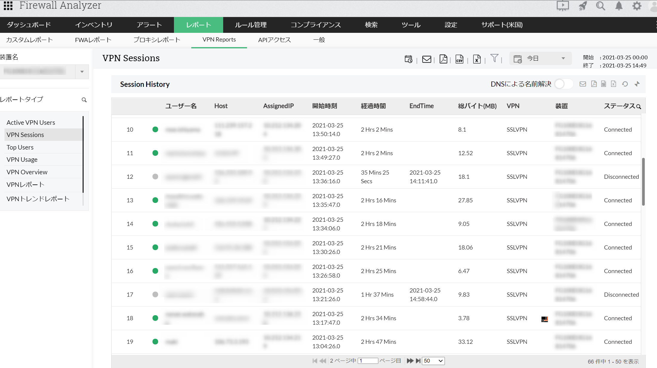 VPNセッションレポートは、VPN通信が発生したユーザー情報を表示します。