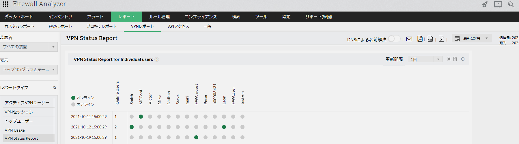 アクティブVPNユーザーレポートが、指定した期間におけるオンラインのVPN情報(ユーザー名、IP、VPN接続時刻、経過時間)を表示するのに対し、