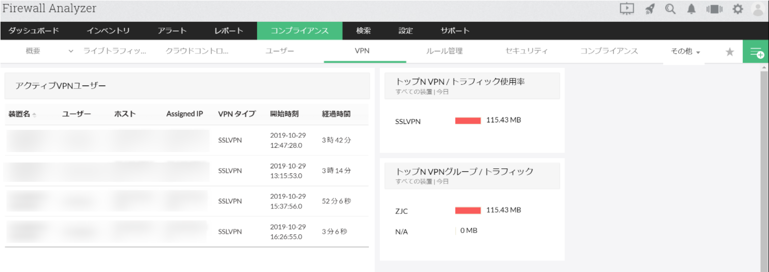 [VPN]タブでは、ファイアウォールを通過するVPN通信のトラフィック使用率、VPNグループとユーザー情報を表示します。