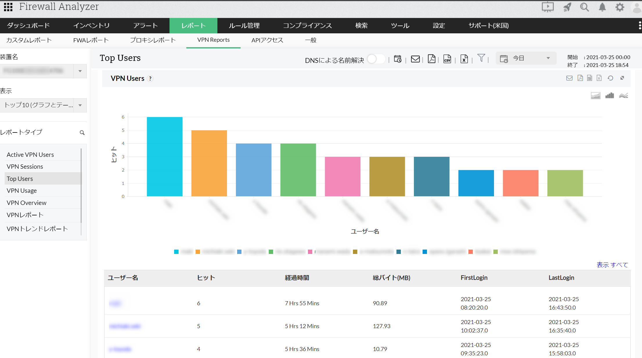 トップユーザーレポートは、VPN接続の回数(ヒット数)が多いユーザー情報を表示します。