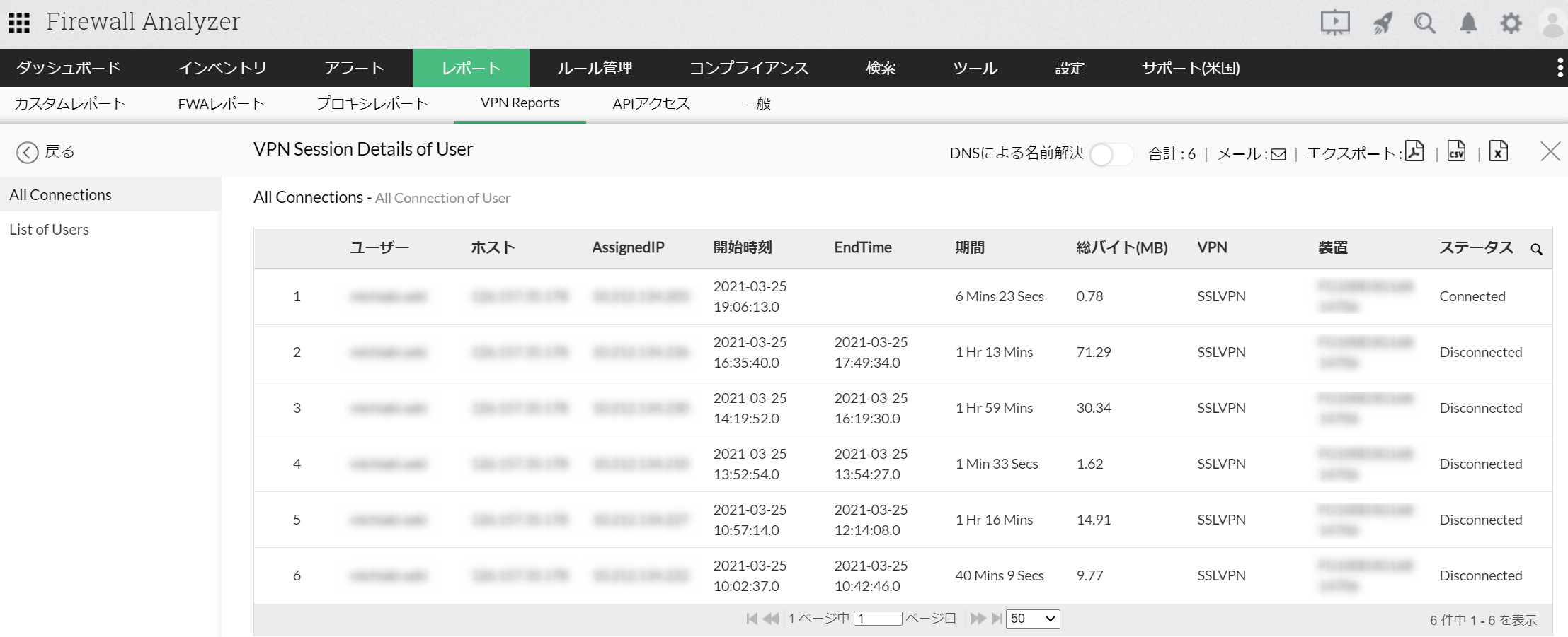 | すべての接続 | 該当ユーザーの各VPNセッション情報(ユーザー名、ホスト、割り当てIP、開始時刻、終了時間、期間、総バイト(MB)、VPN、装置、ステータス)が一覧で表示されます。 |