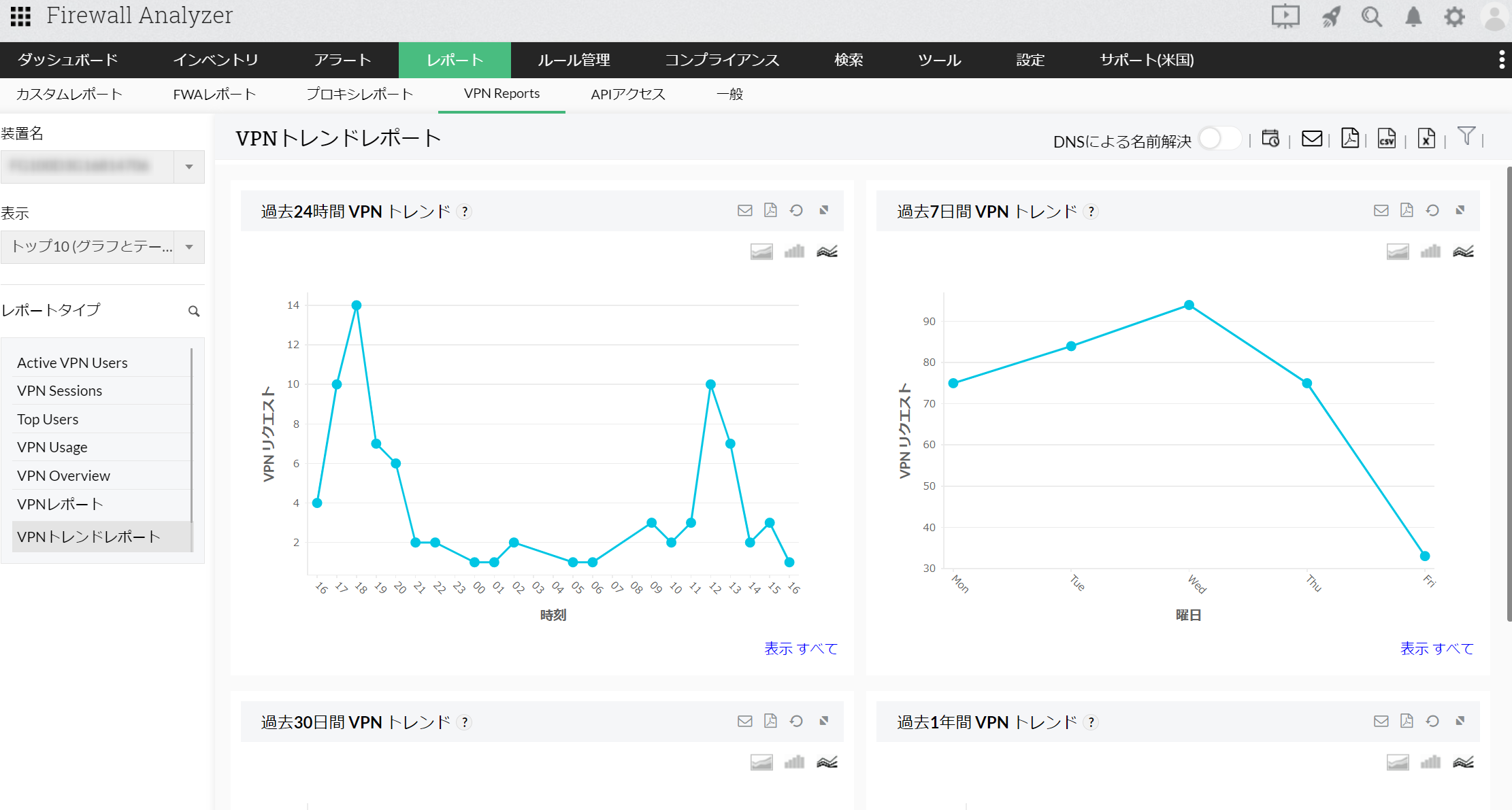 過去7日間におけるVPNセッション数を、曜日単位で時系列で表示します。 - 最新30日間のVPNトレンド: