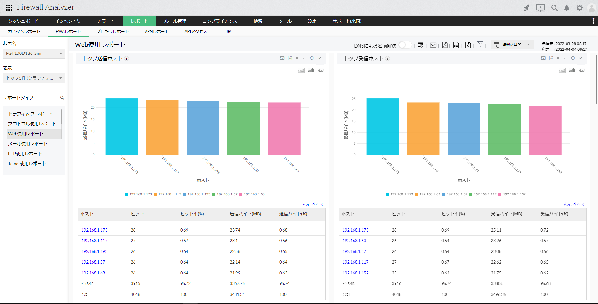 | トップ通信 | Webプロトコルを使用している上位の通信を表示します。ホスト、宛先、プロトコル、ヒット数、送信/受信/合計バイト(MB)、送信/受信/合計バイト(%)が一覧で表示されます。 |
