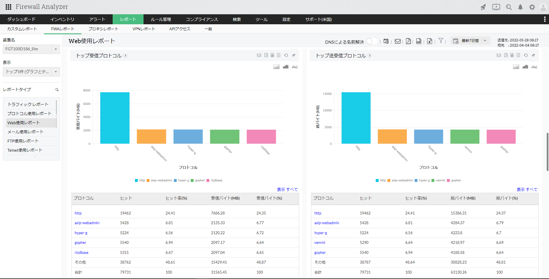 Web使用レポートは、ファイアウォールを通過(permit/accept)したWebプロトコルグループに基づいた帯域使用率を表示します。