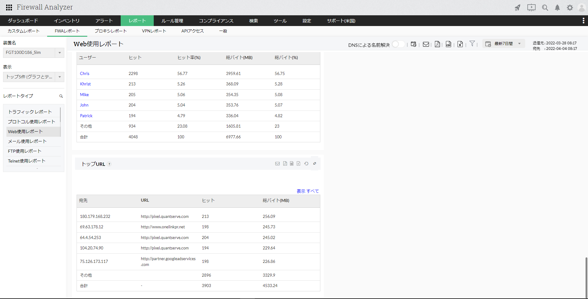 | トッププロトコル | ユーザーが使用している上位のWebプロトコルを表示します。ヒット数、送信/受信/合計バイト(MB)が一覧で表示されます。 |