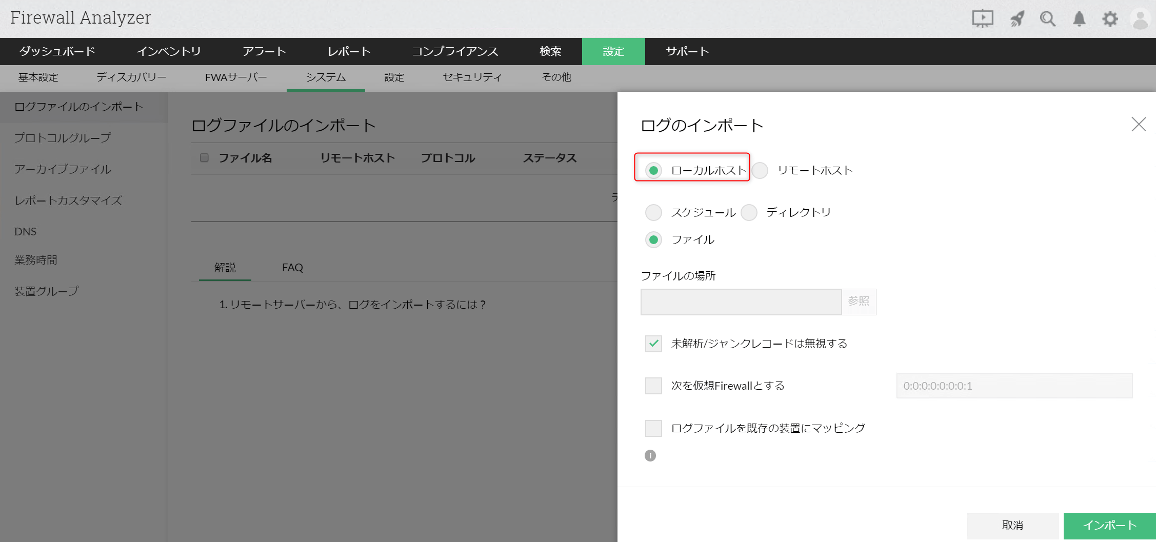 Firewall Analyzerでログを収集する方法として、ファイアウォールやプロキシ装置からログを直接転送する方法と、ログファイルをインポートして取り込む2つの方法があります。本ページでは、ログファイルのインポート機能について記載します。