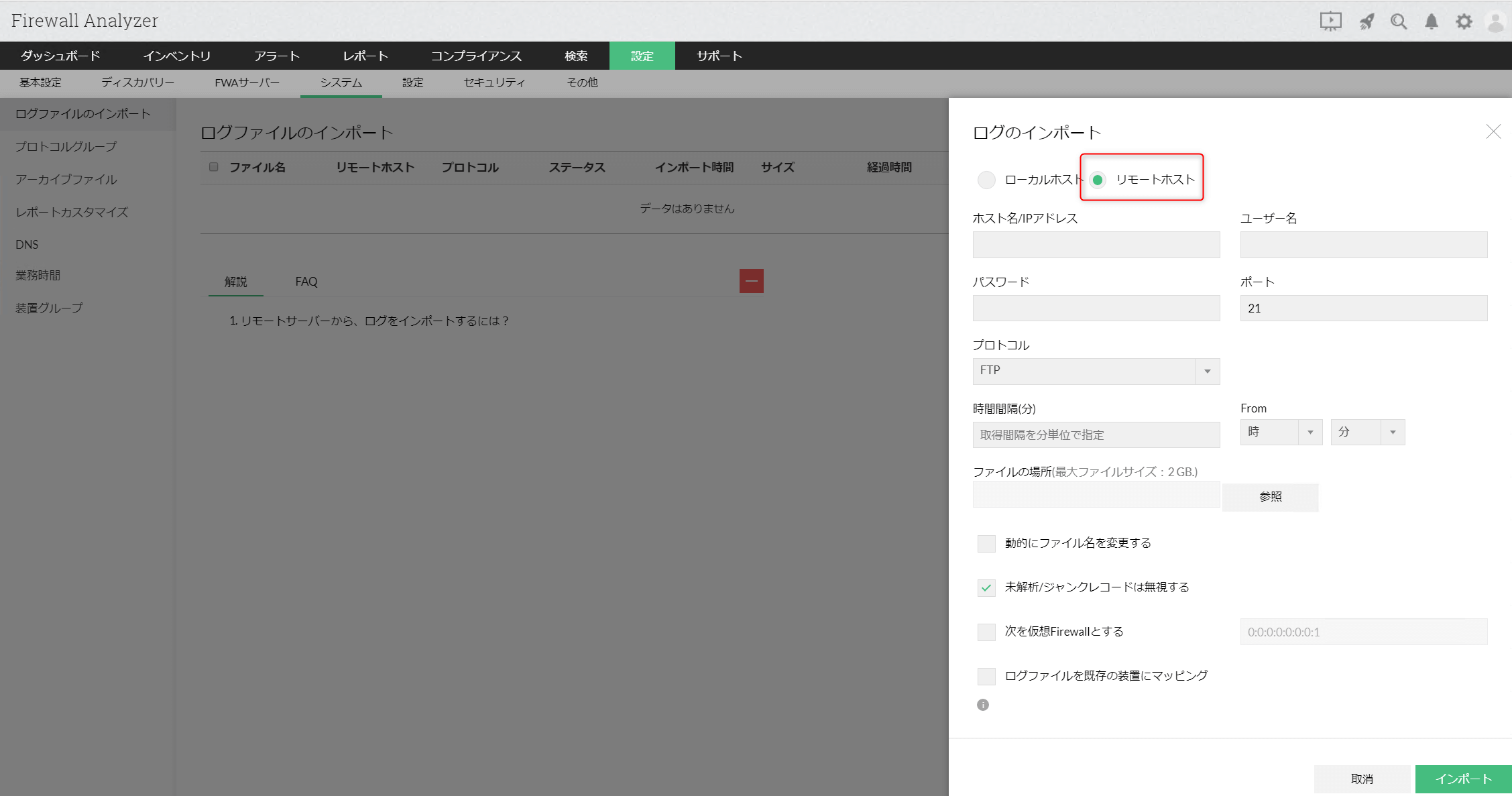 リモートサーバー上に保管しているログファイル(syslogファイル、アクセスログファイル)をインポートします。