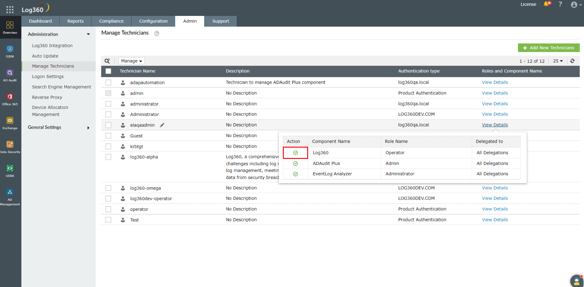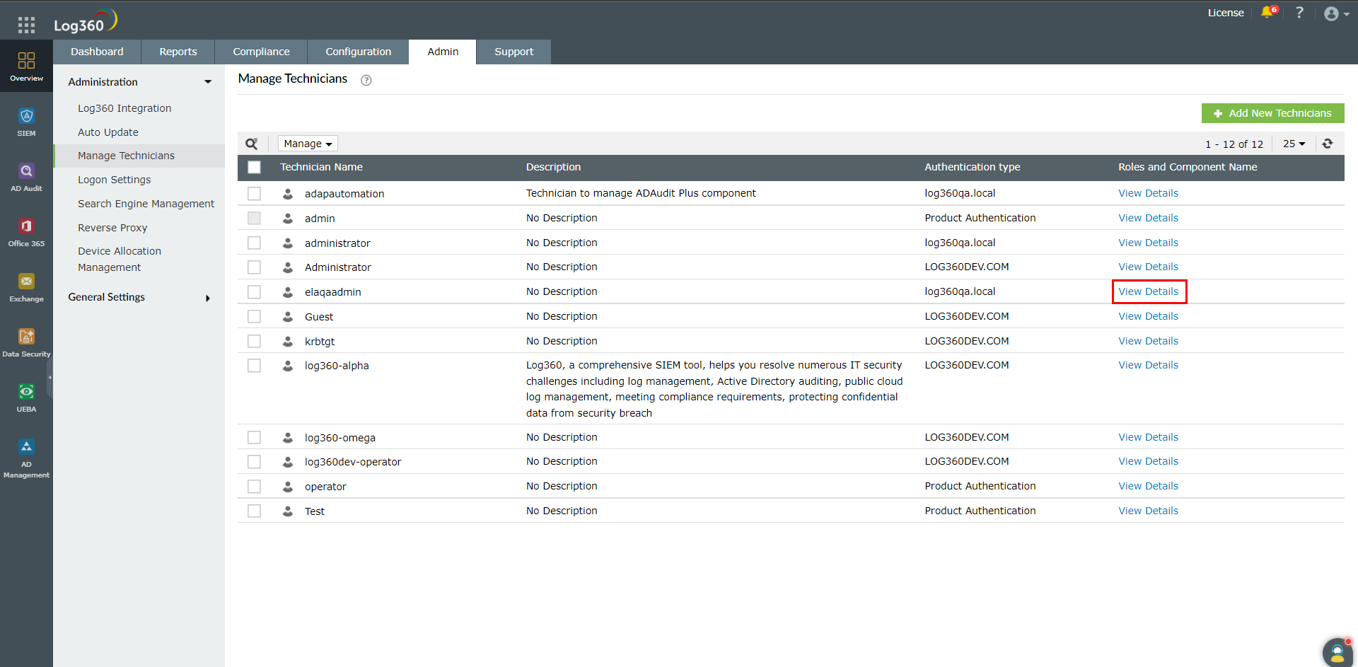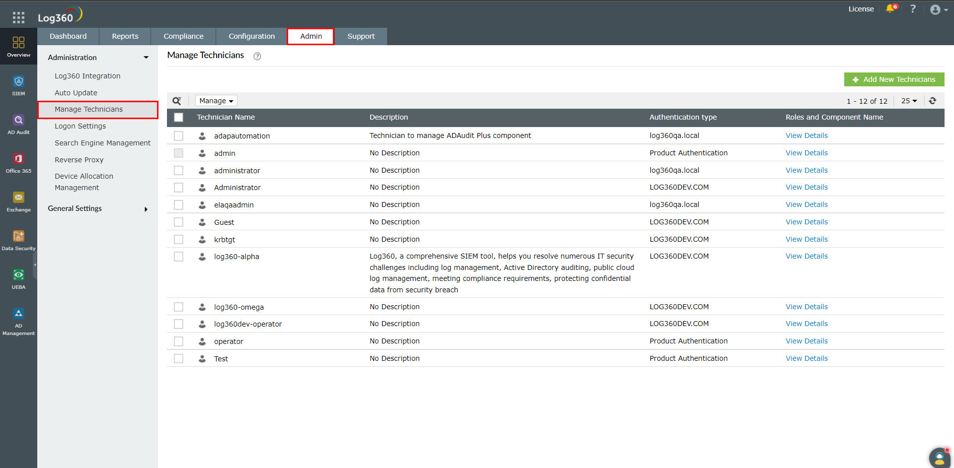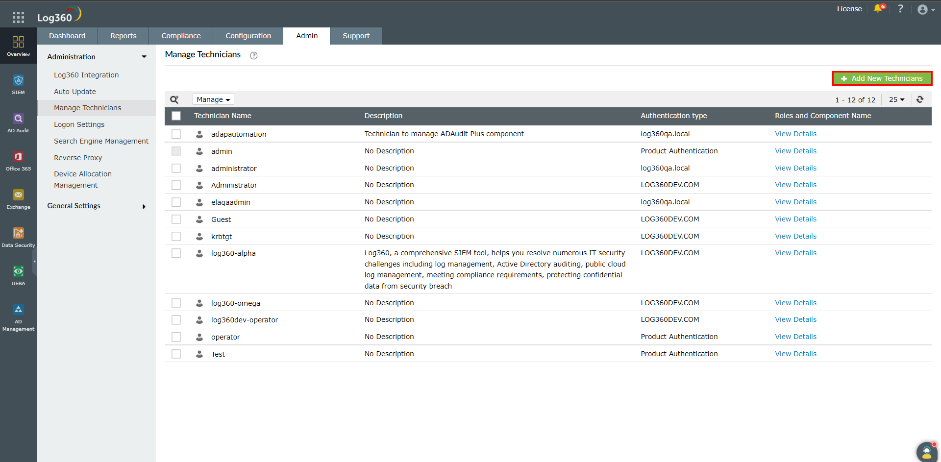 各コンポーネント製品にも、技術者の管理機能がありますが、Log360の技術者機能を使用して技術者を一元管理することを推奨します。一元化されたダッシュボードから確認することで、各コンポーネント製品における各技術者の役割をより明確に把握できるためです。