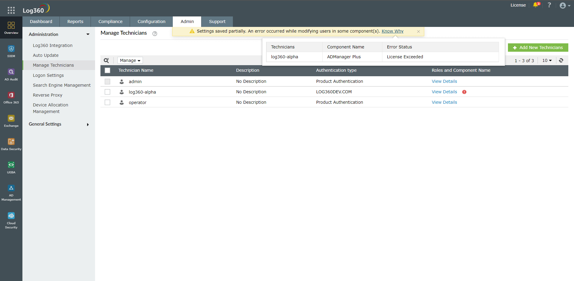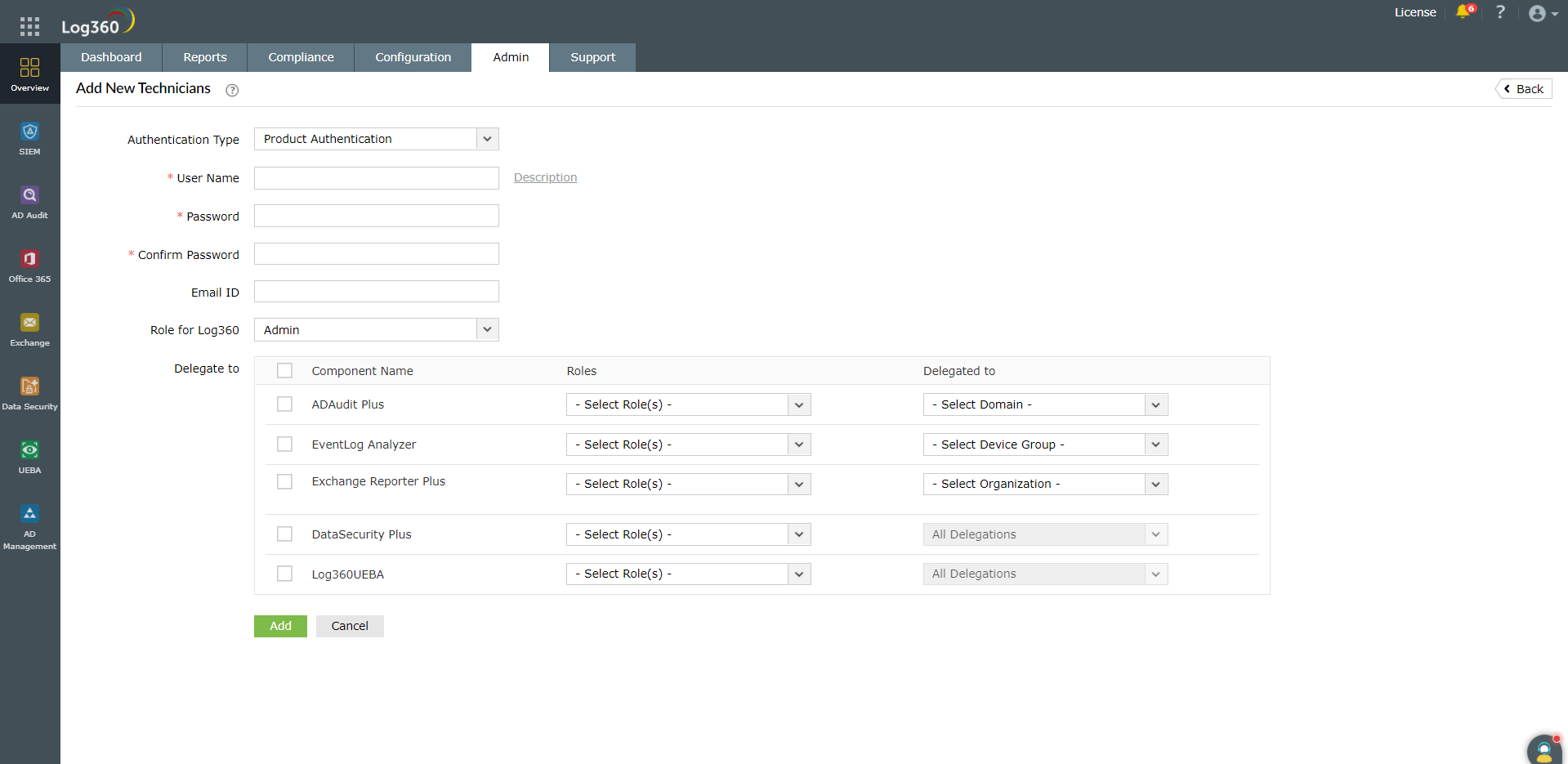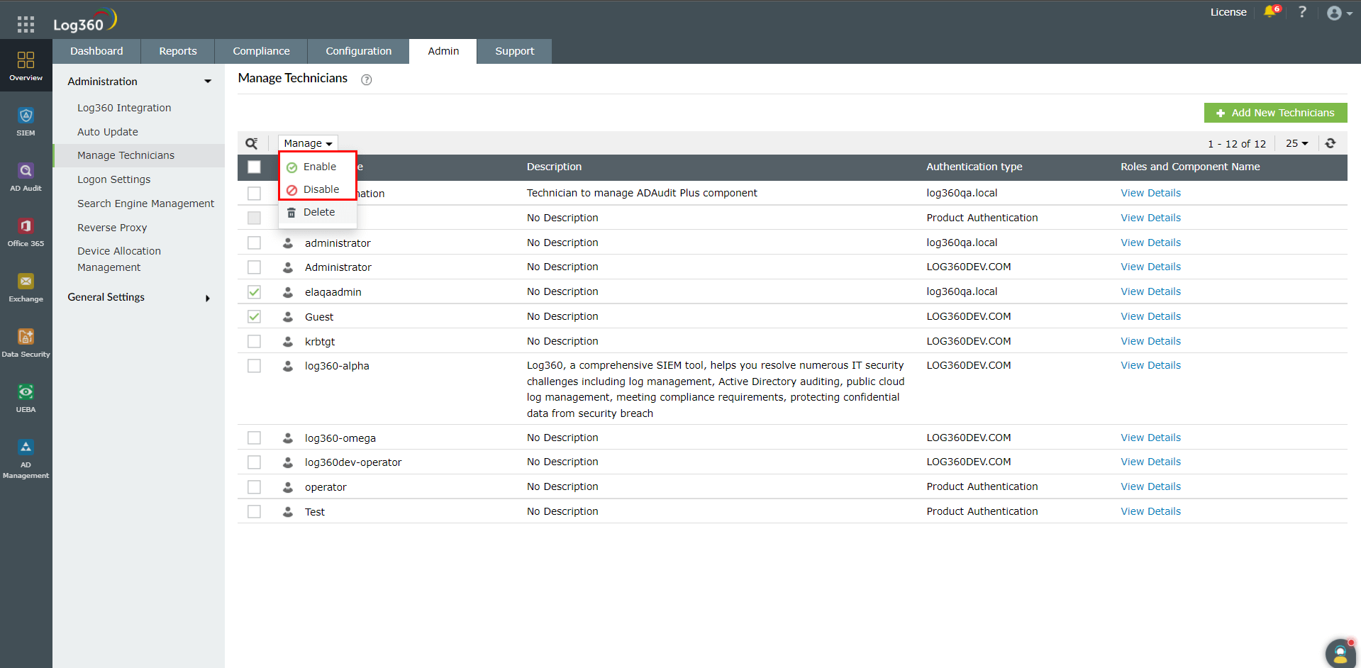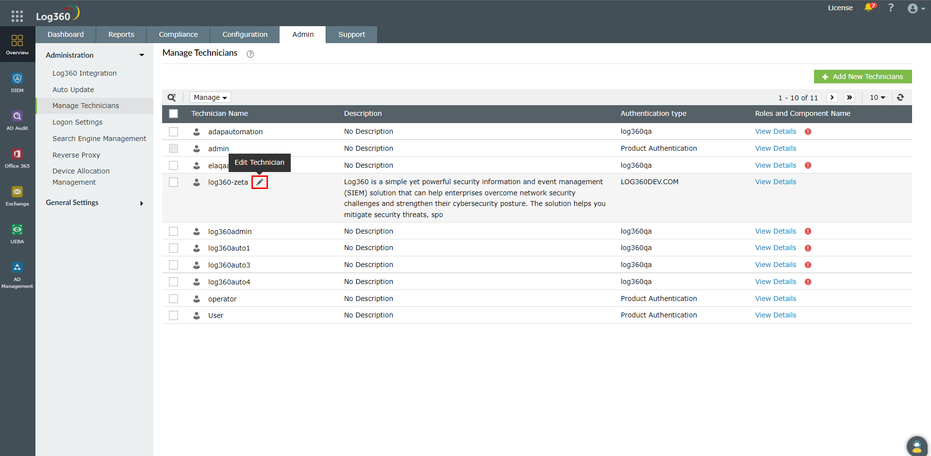 各コンポーネント製品にも、技術者の管理機能がありますが、Log360の技術者機能を使用して技術者を一元管理することを推奨します。一元化されたダッシュボードから確認することで、各コンポーネント製品における各技術者の役割をより明確に把握できるためです。